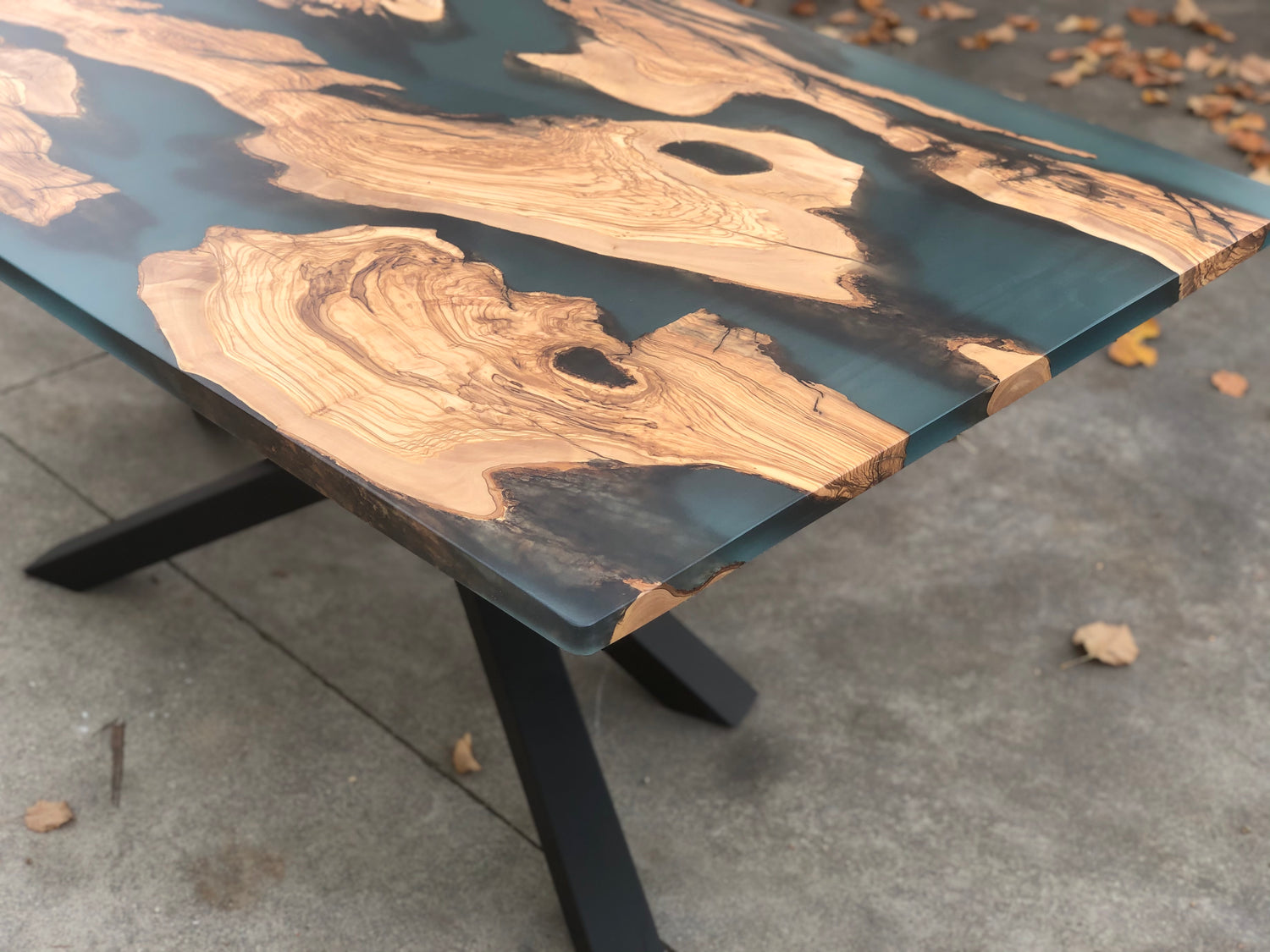 Senna è un tavolo da pranzo in legno di ulivo e resina epossidica trasparente.