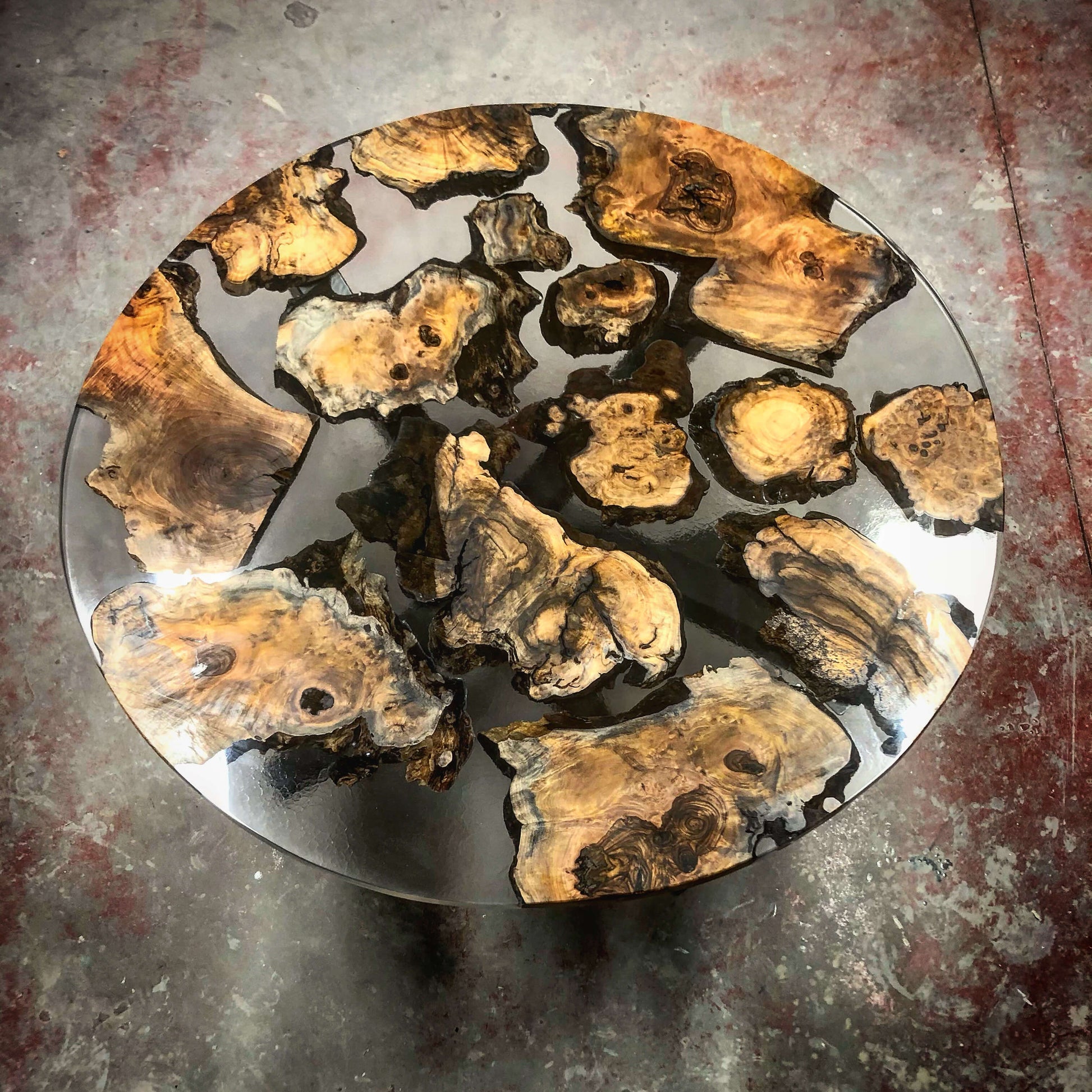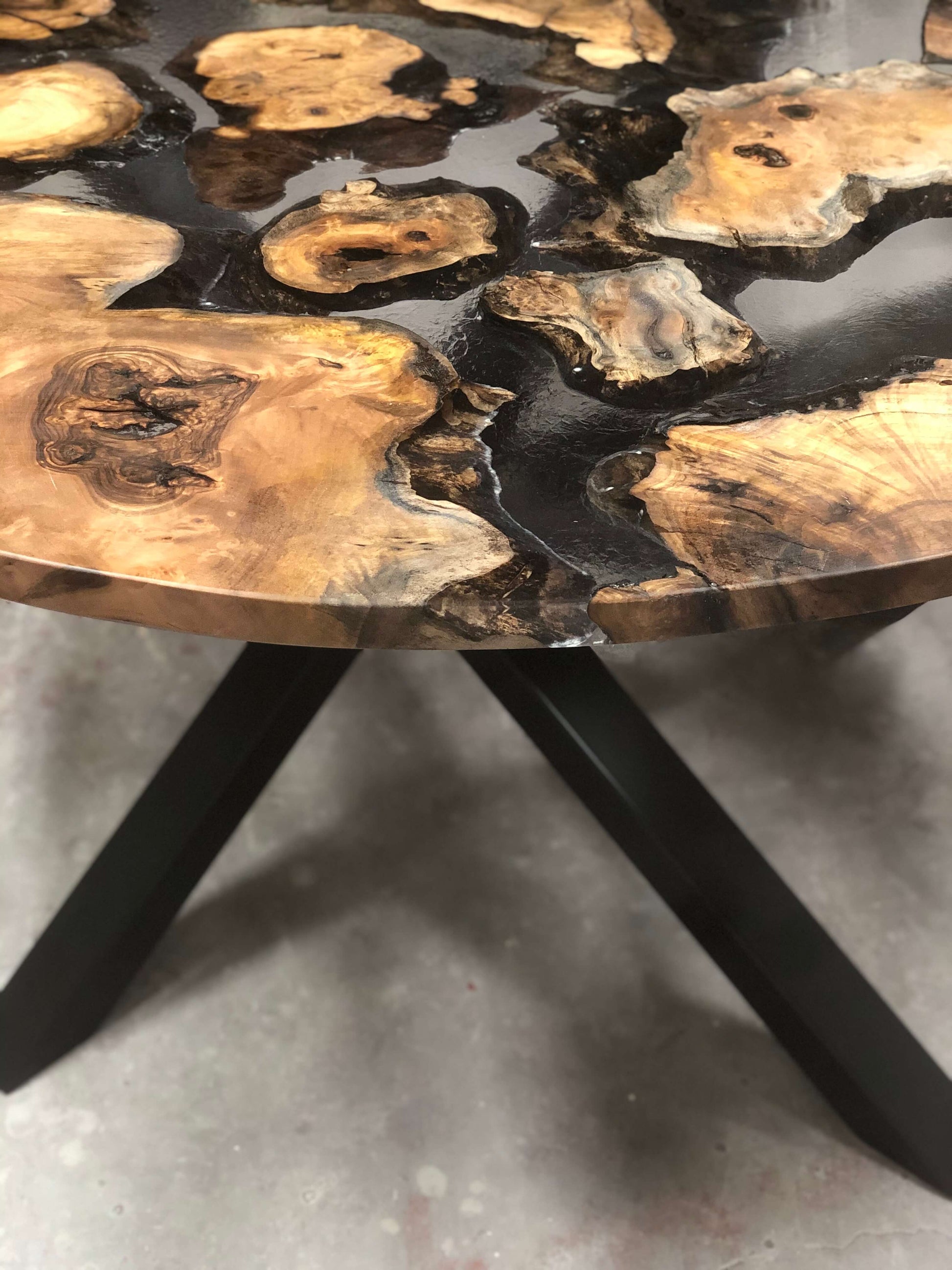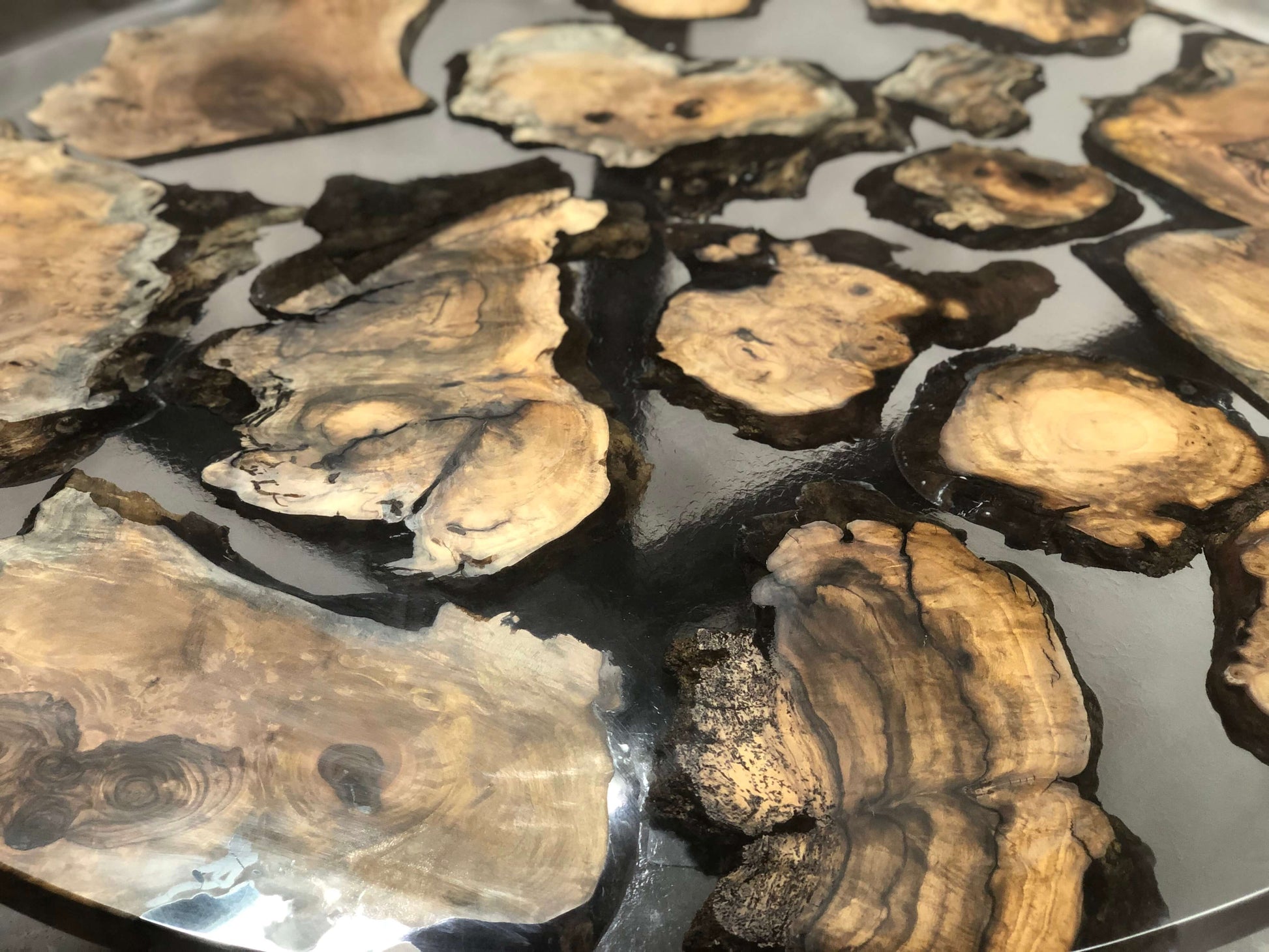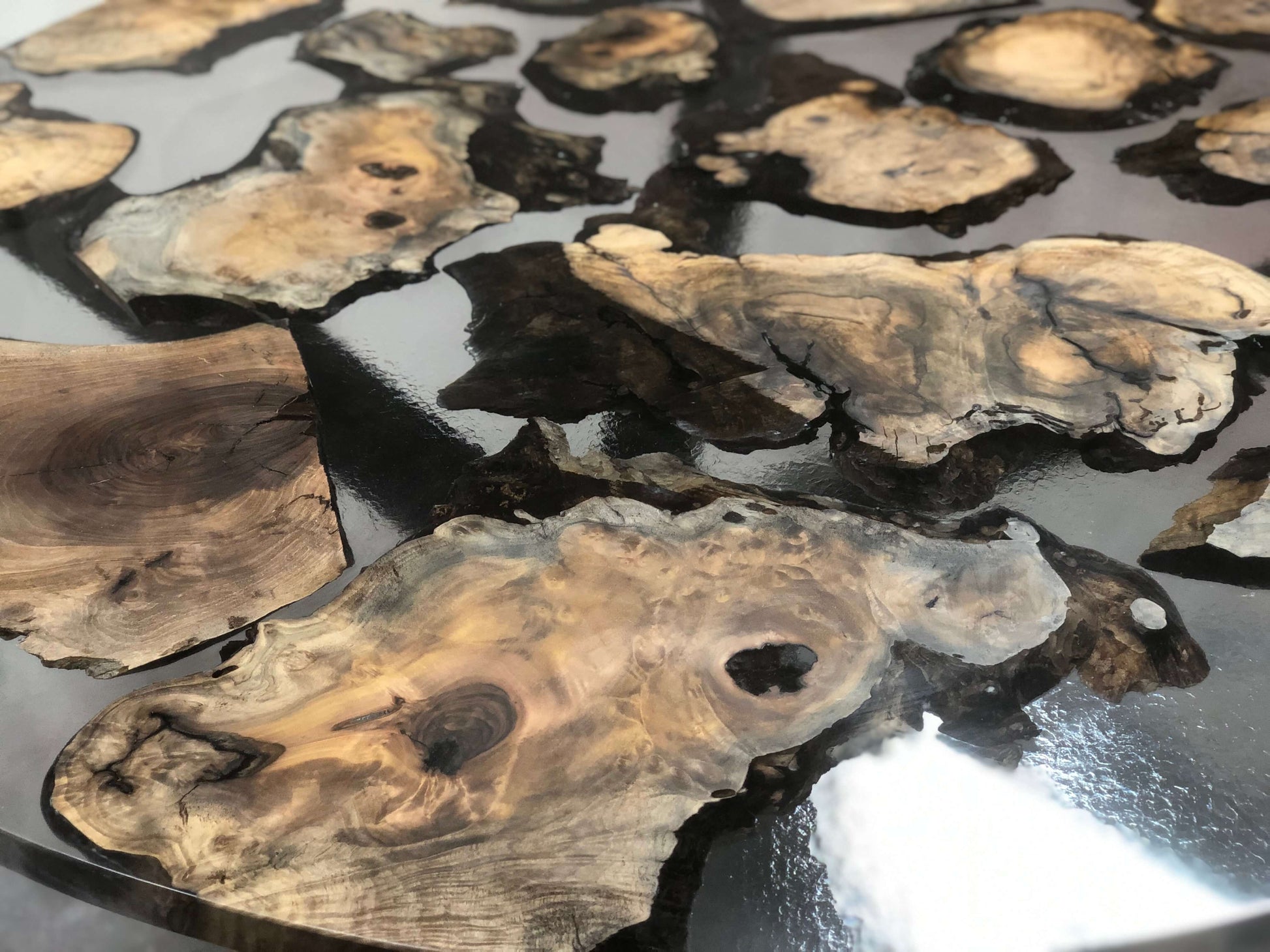 Tranci di radica di noce e resina epossidica trasparente compongono questo tavolo da pranzo rotondo, unico nel suo genere.