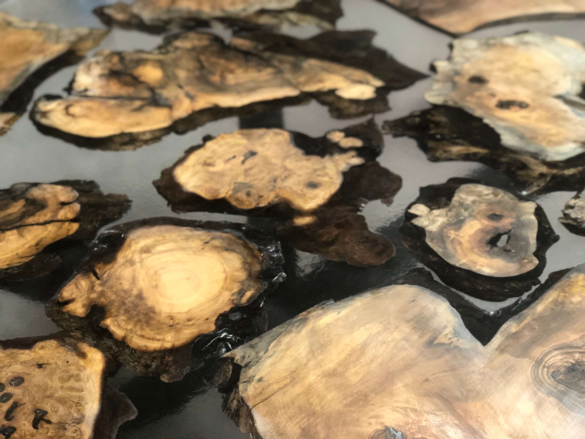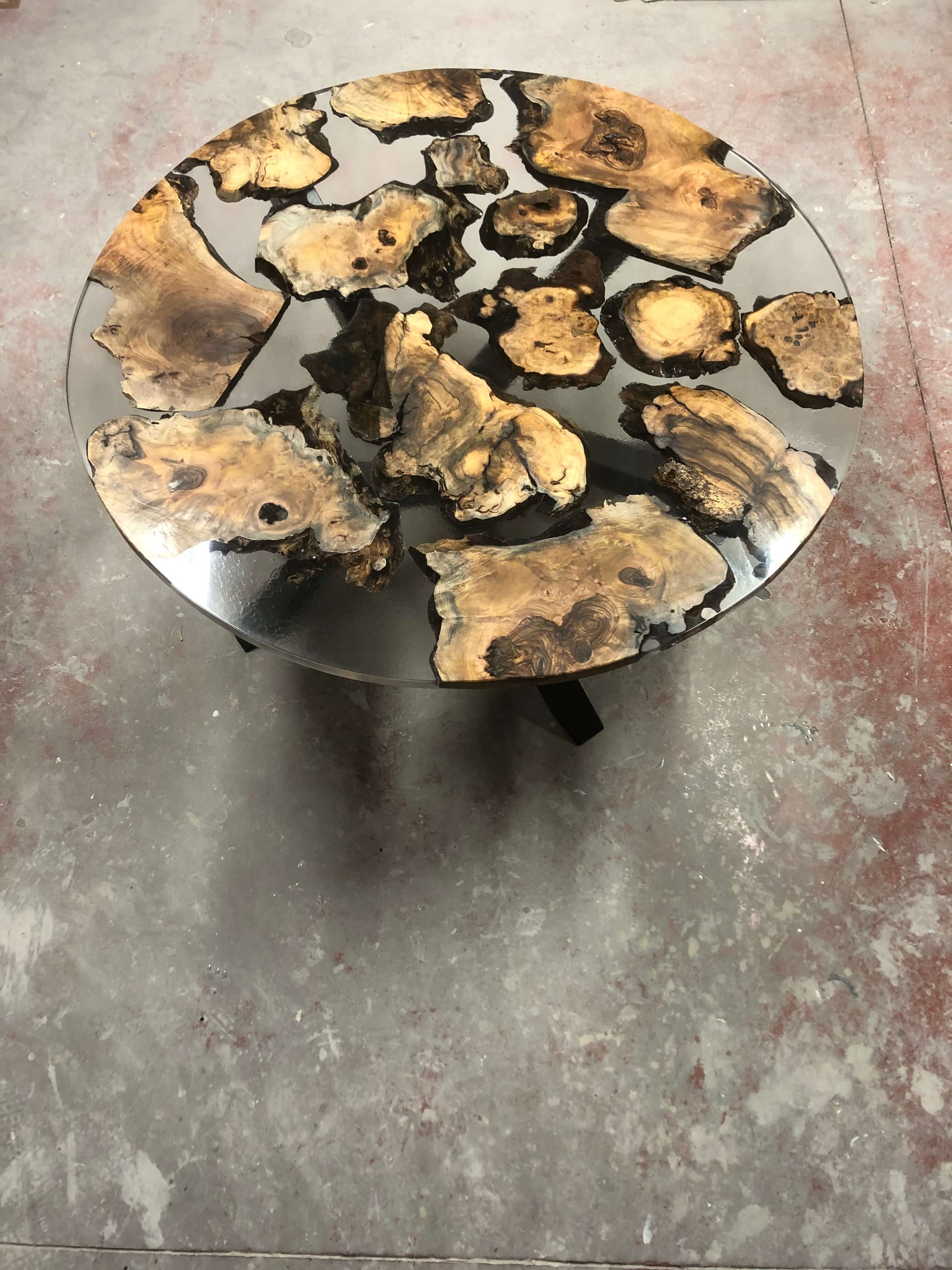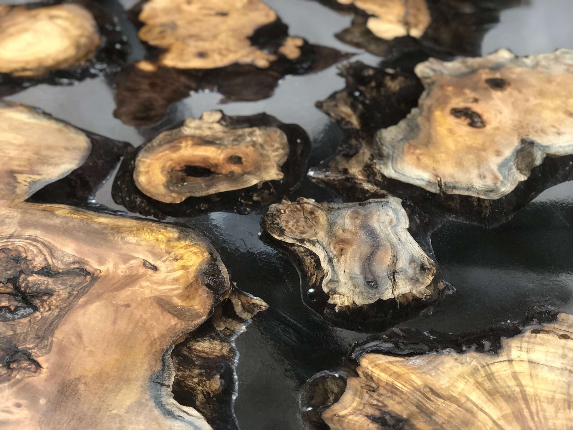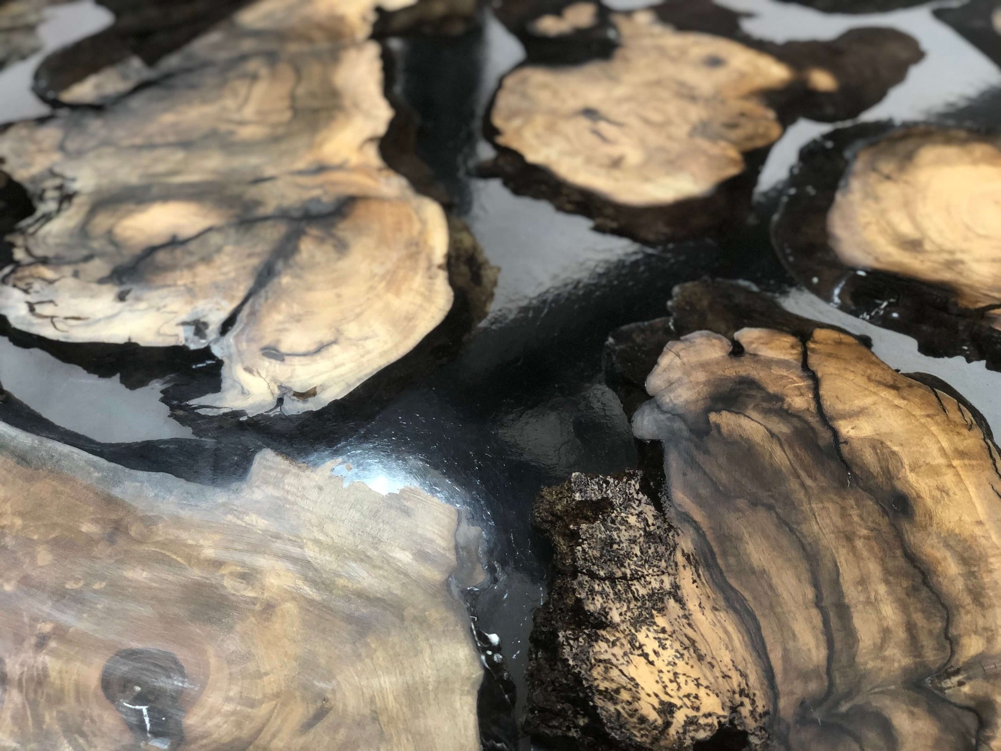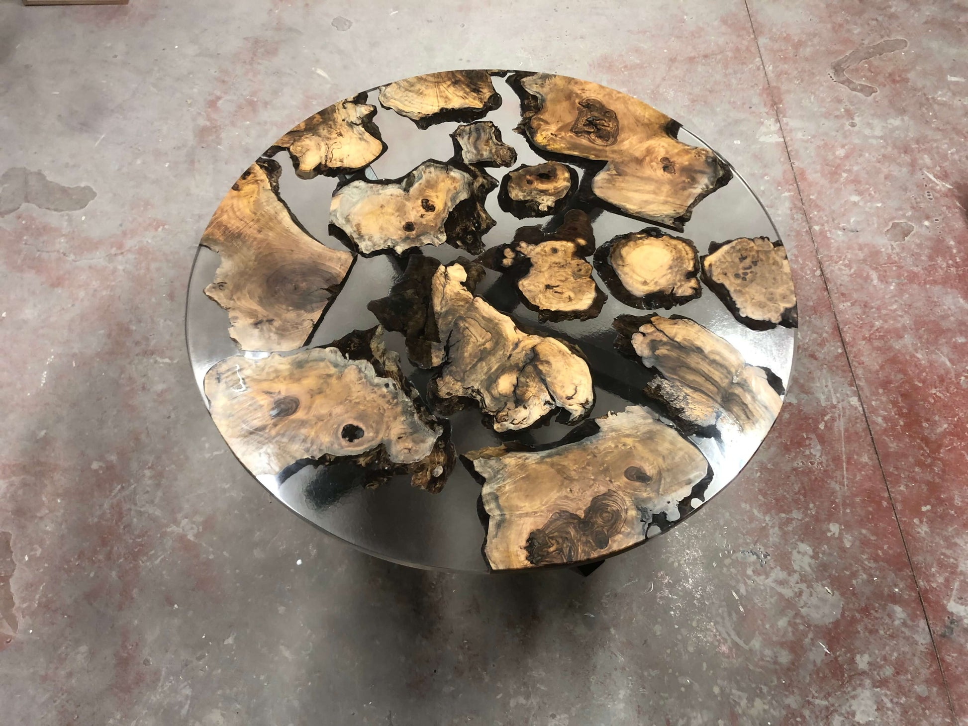 Tranci di radica di noce e resina epossidica trasparente compongono questo tavolo da pranzo rotondo, unico nel suo genere.