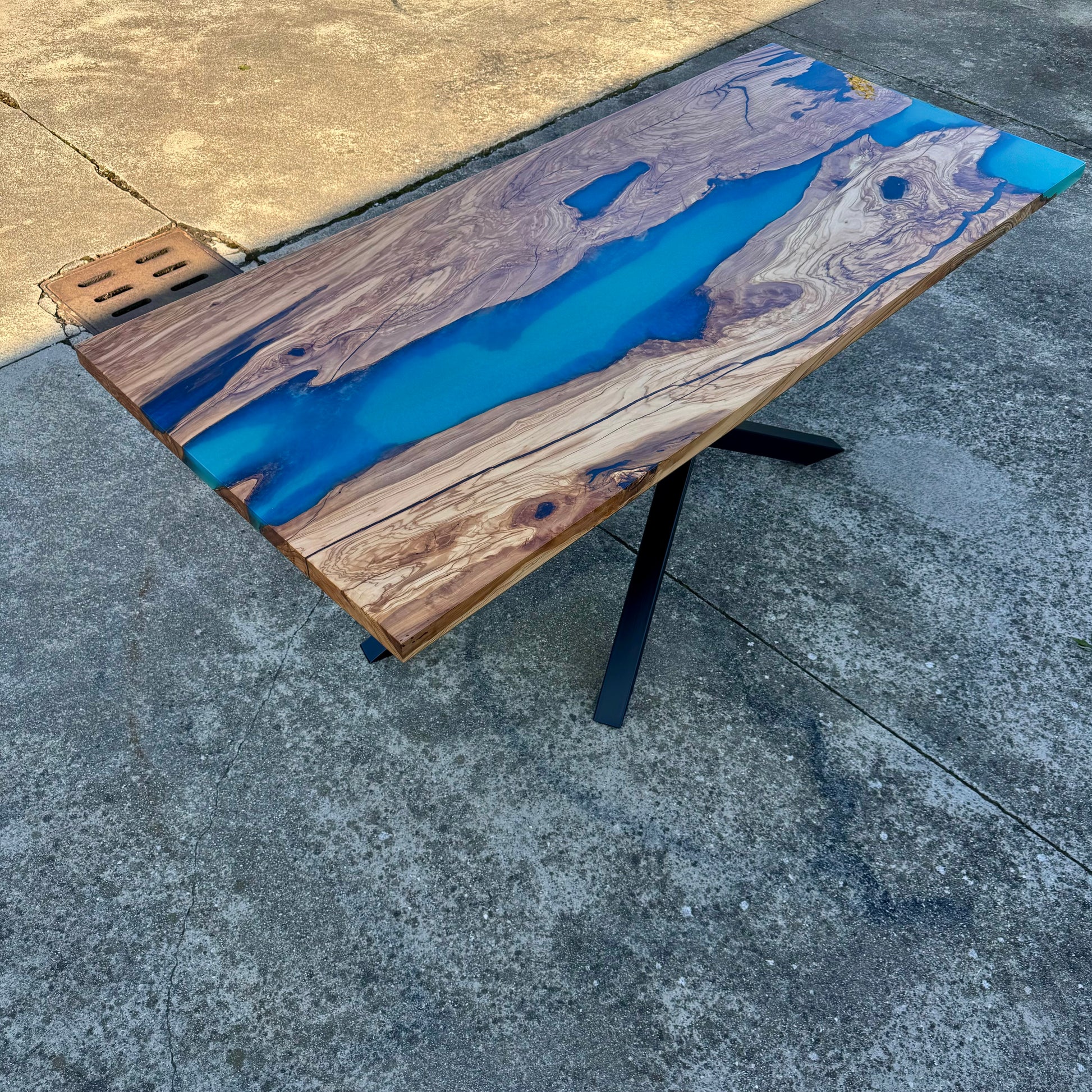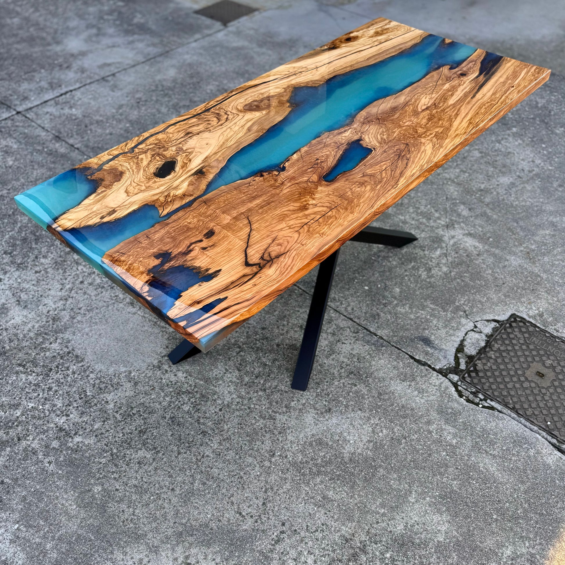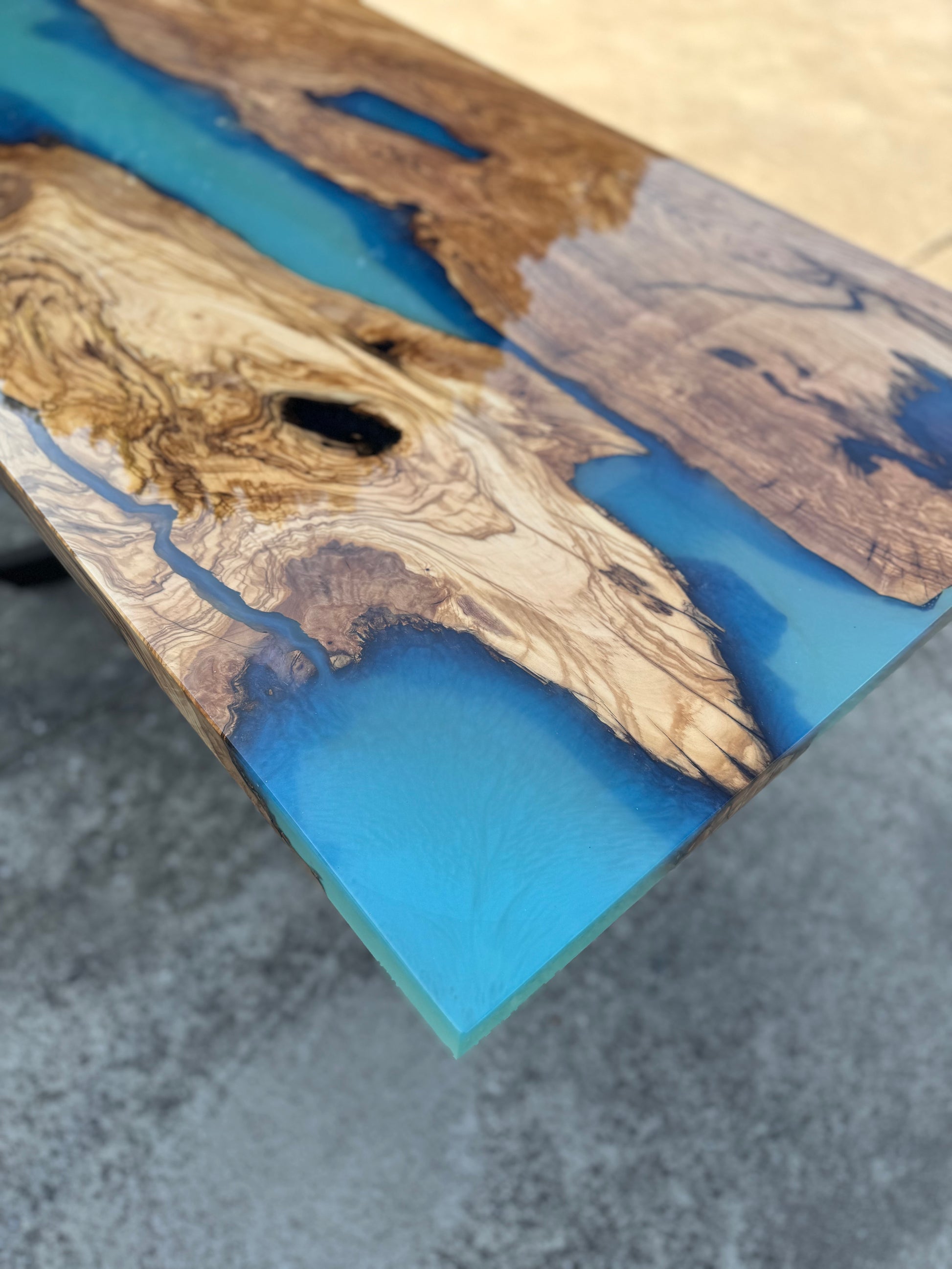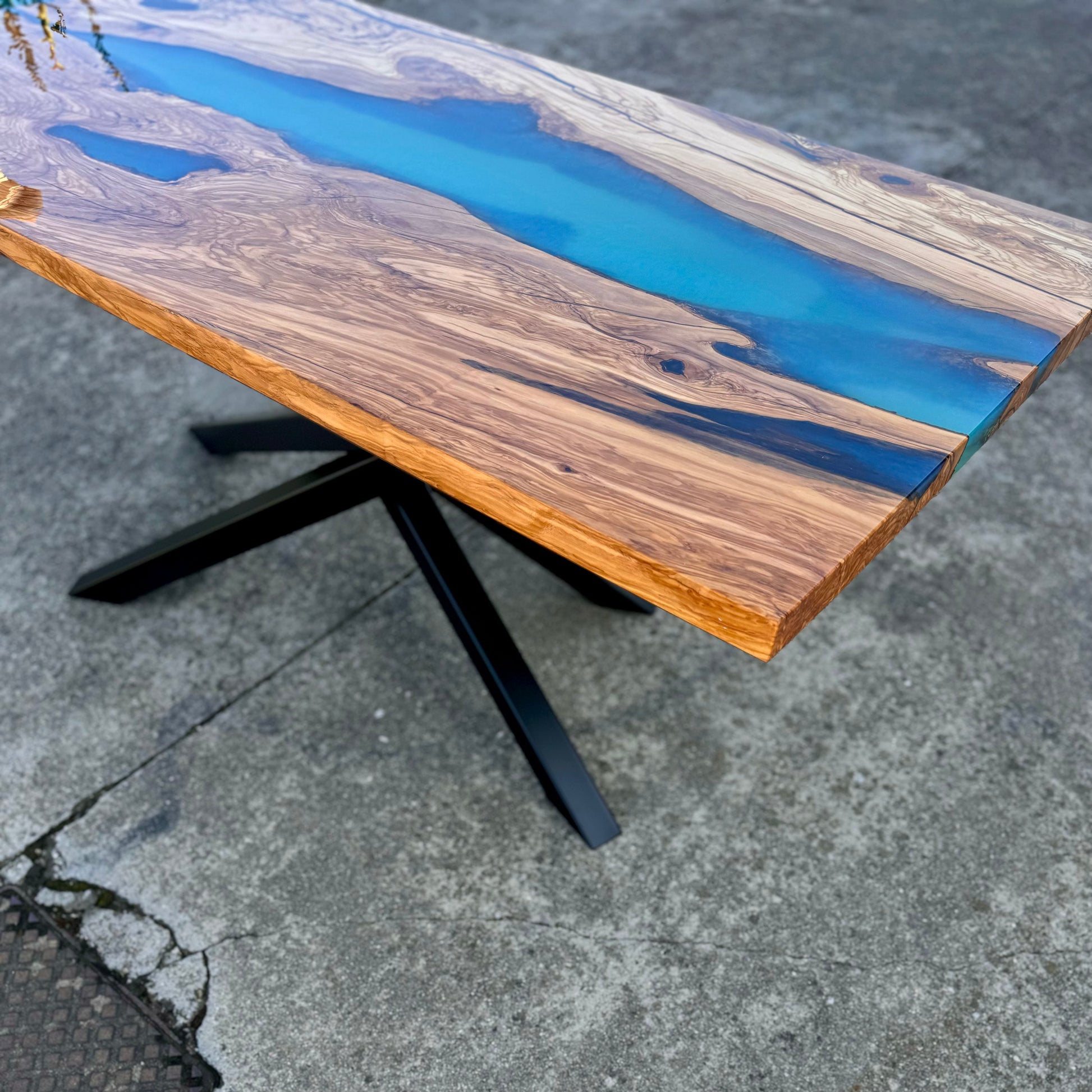 Marea è un River table composto da legno di ulivo e resina epossidica pigmentata azzurro mare.