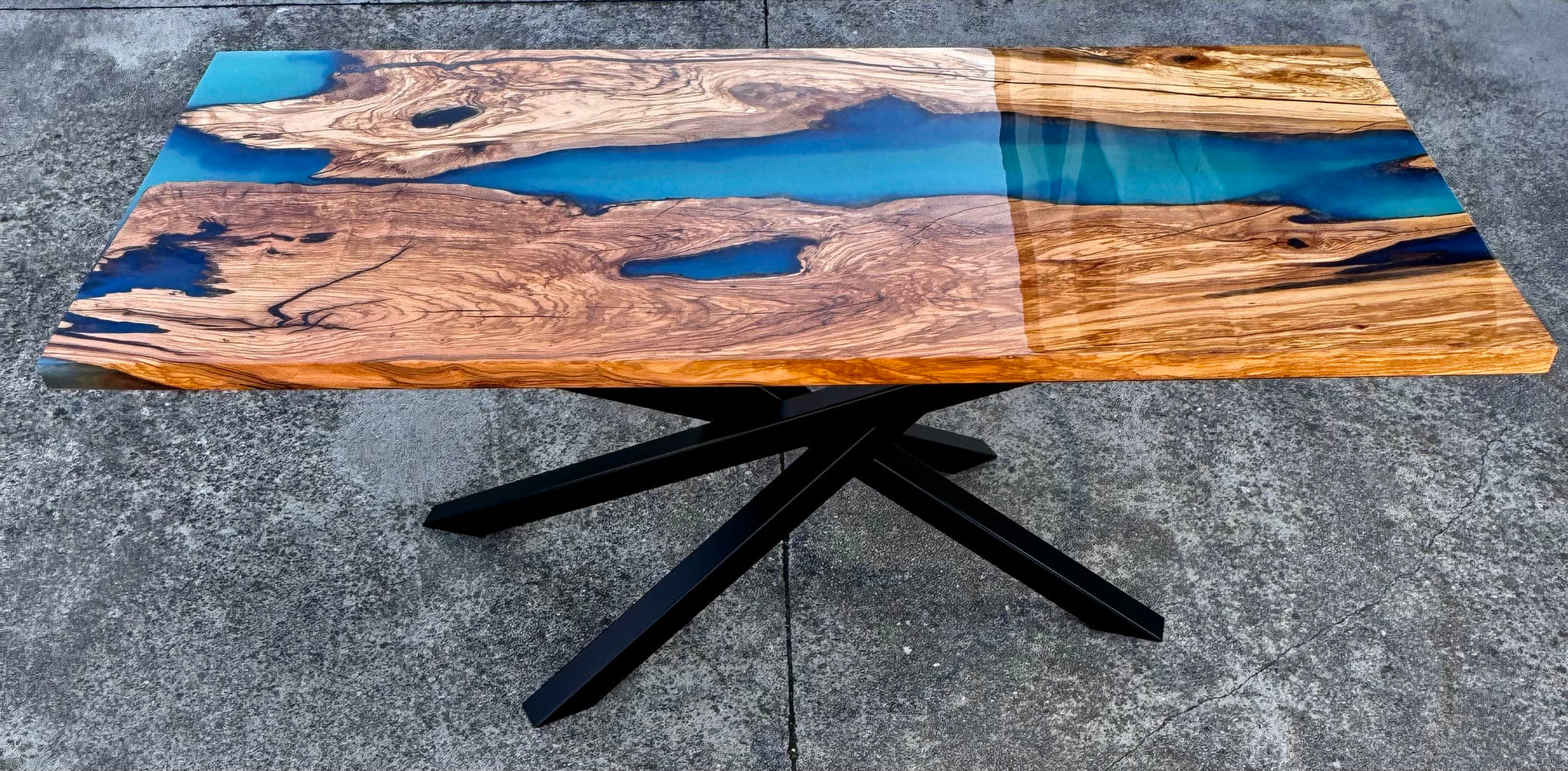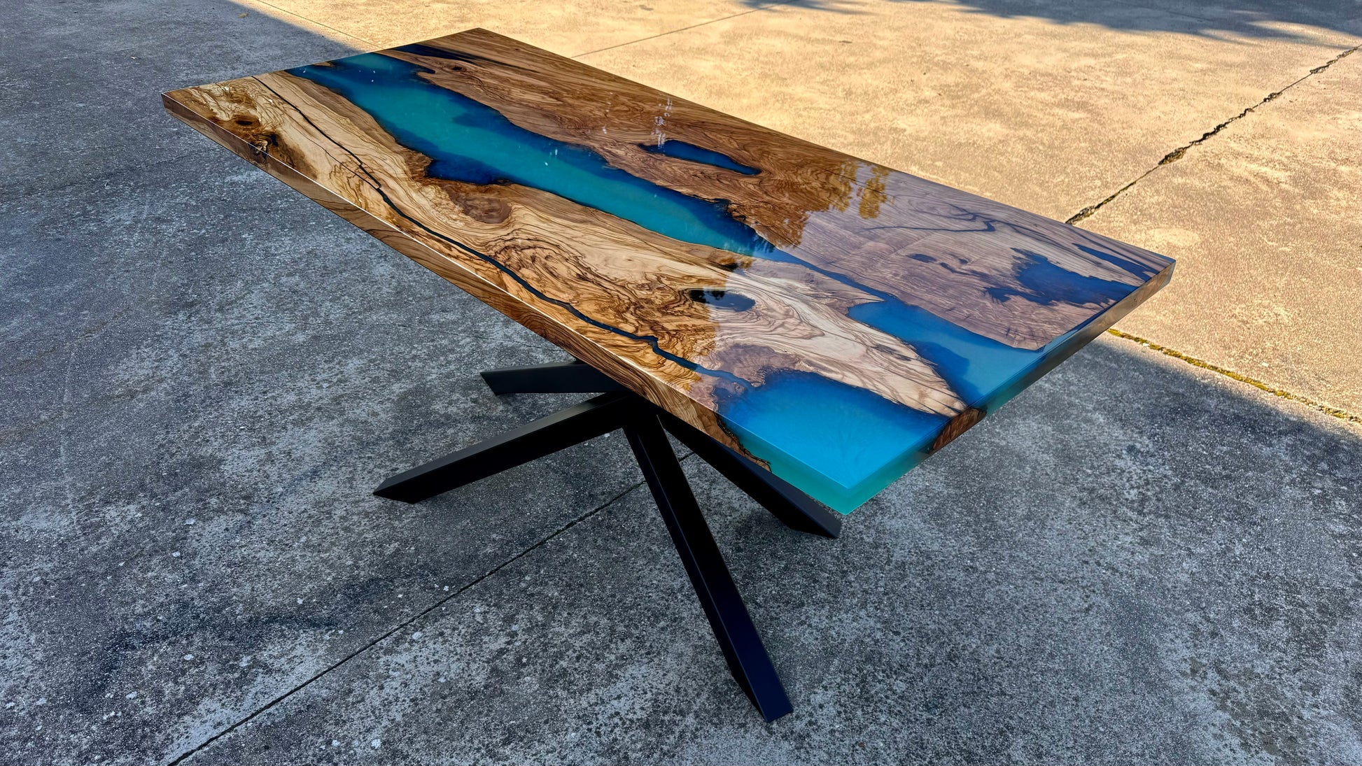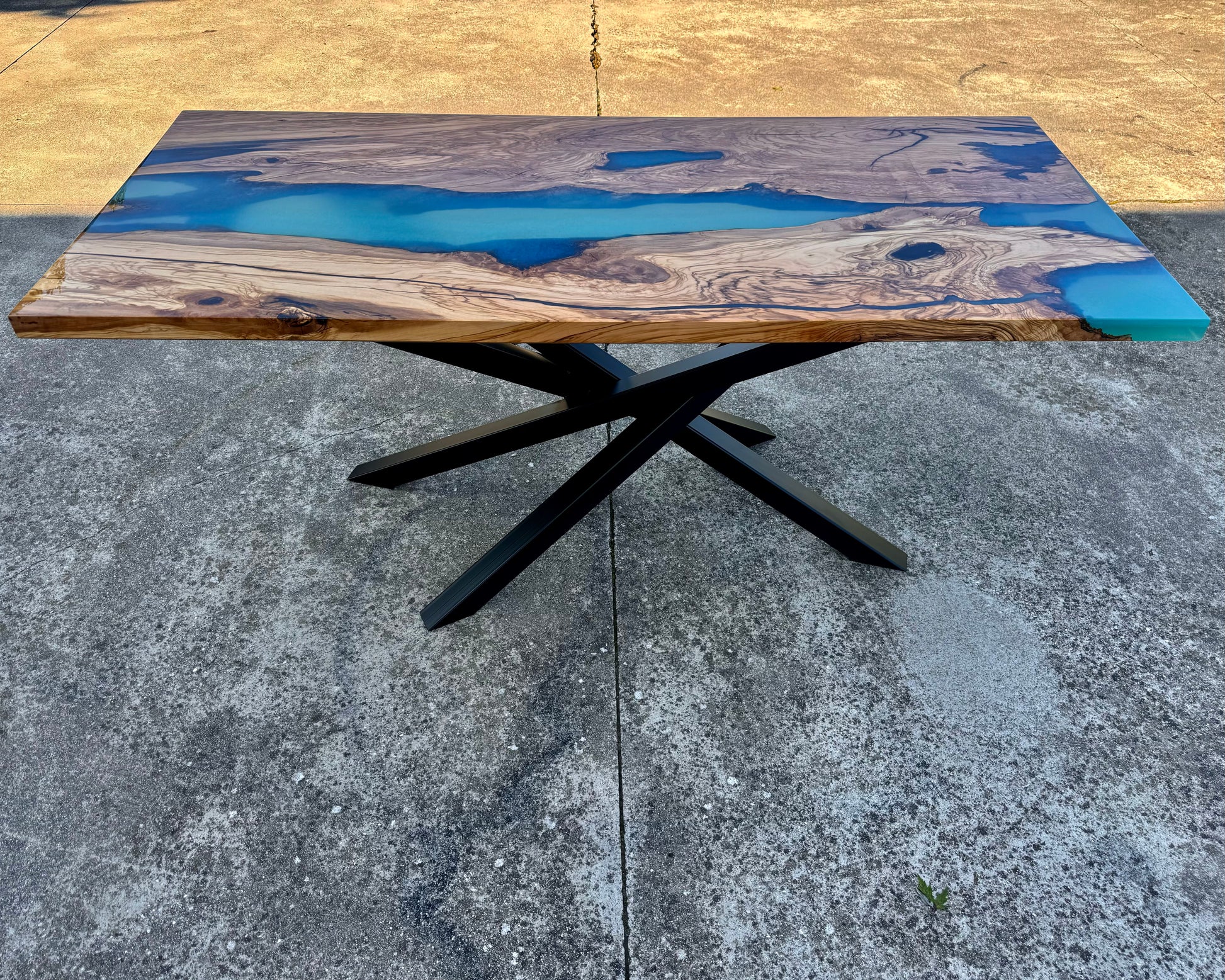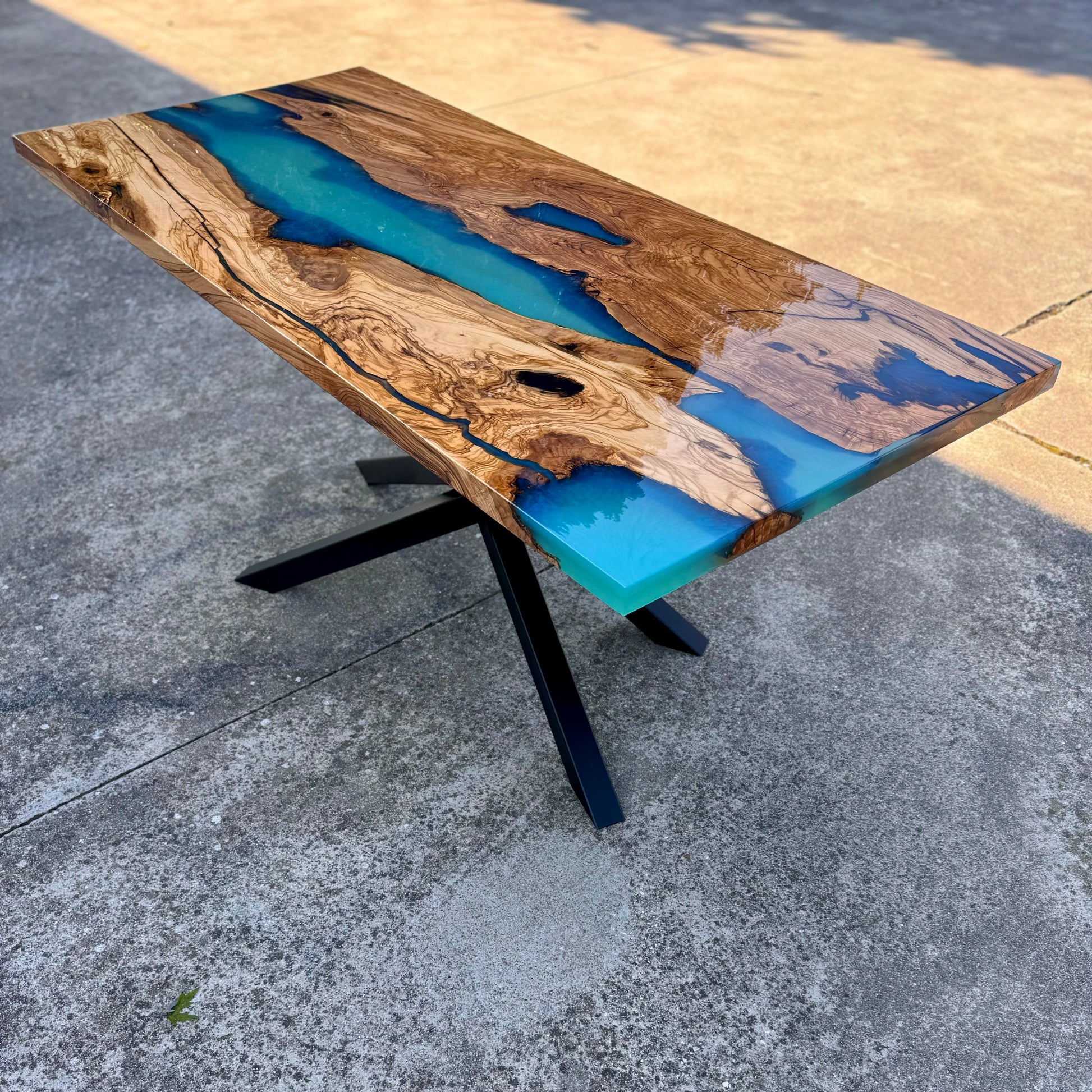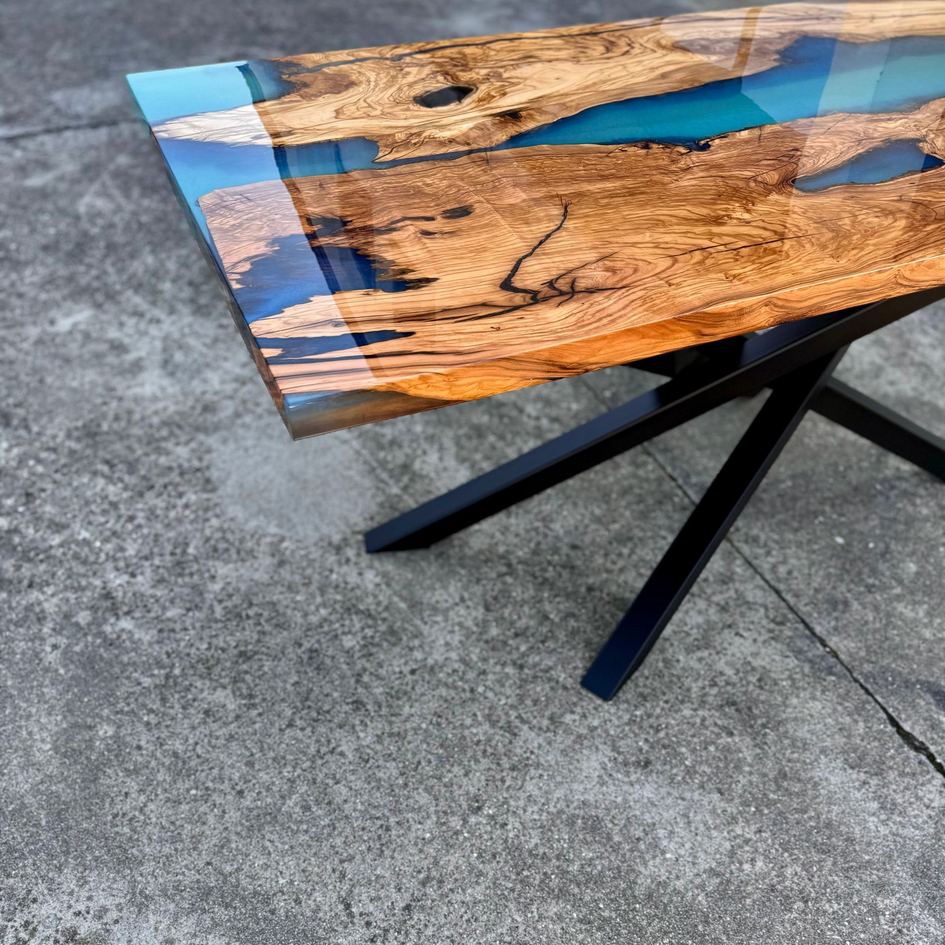 Marea è un River table composto da legno di ulivo e resina epossidica pigmentata azzurro mare.