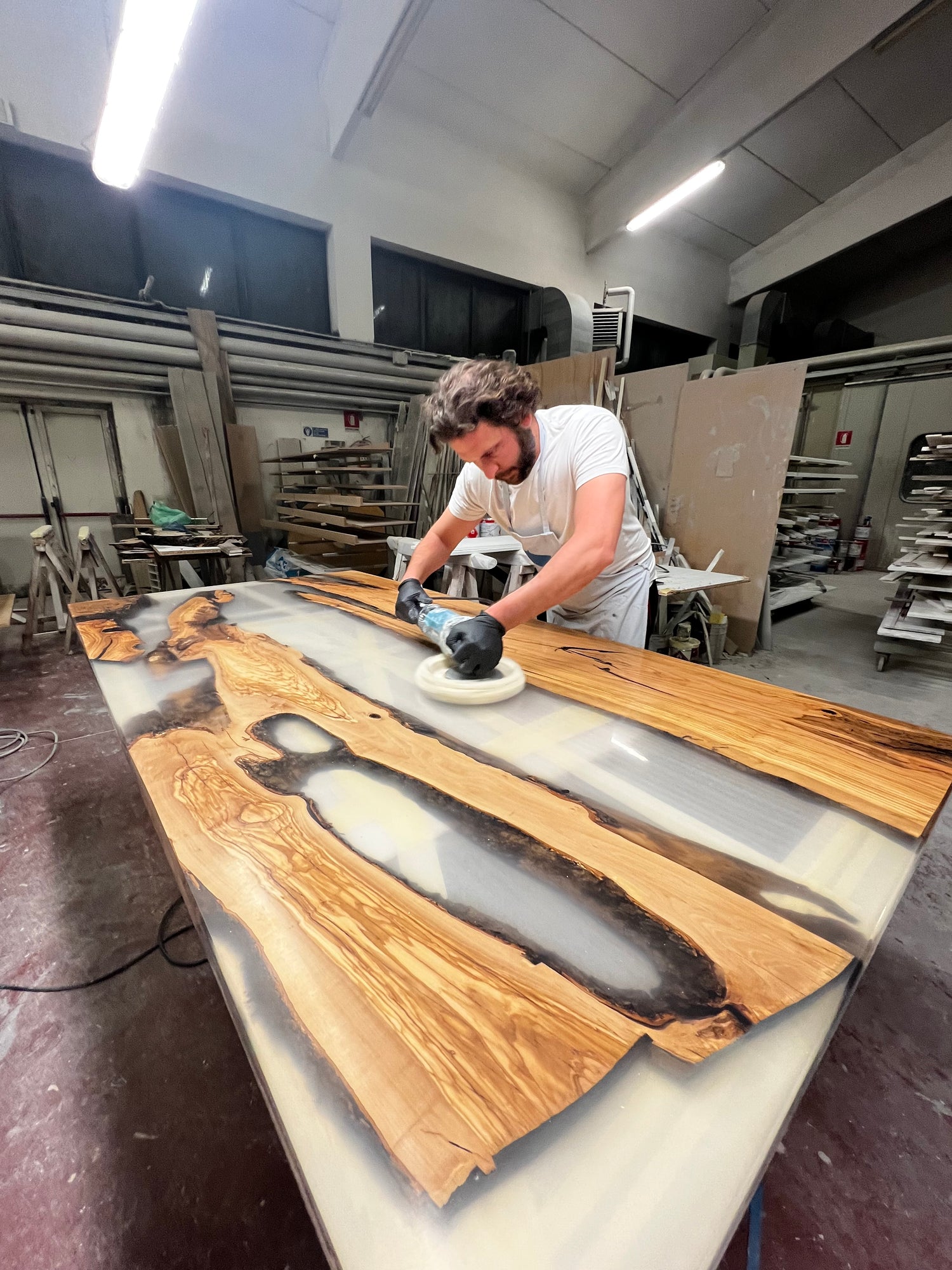 Si potrà dunque procedere alla realizzazione del tavolo con la colata della resina, i vari processi di levigatura e la finitura del top tavolo.