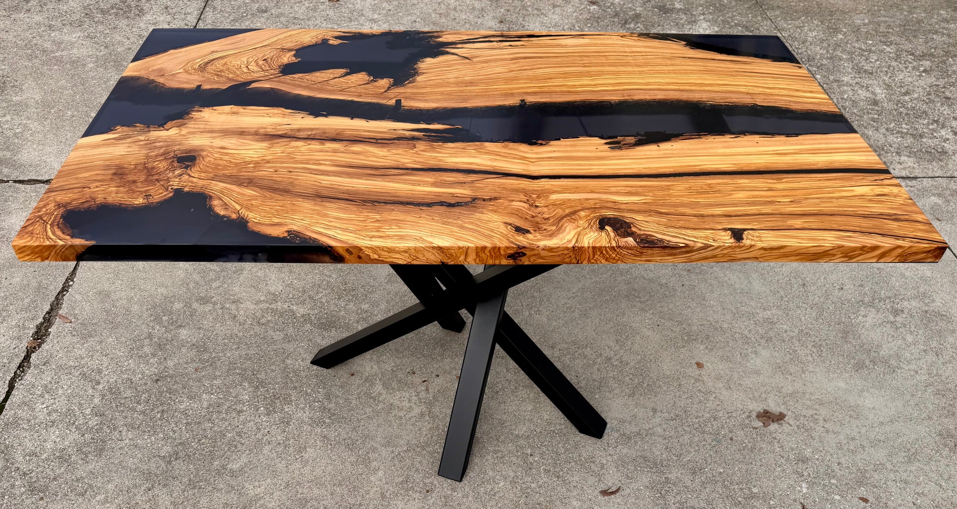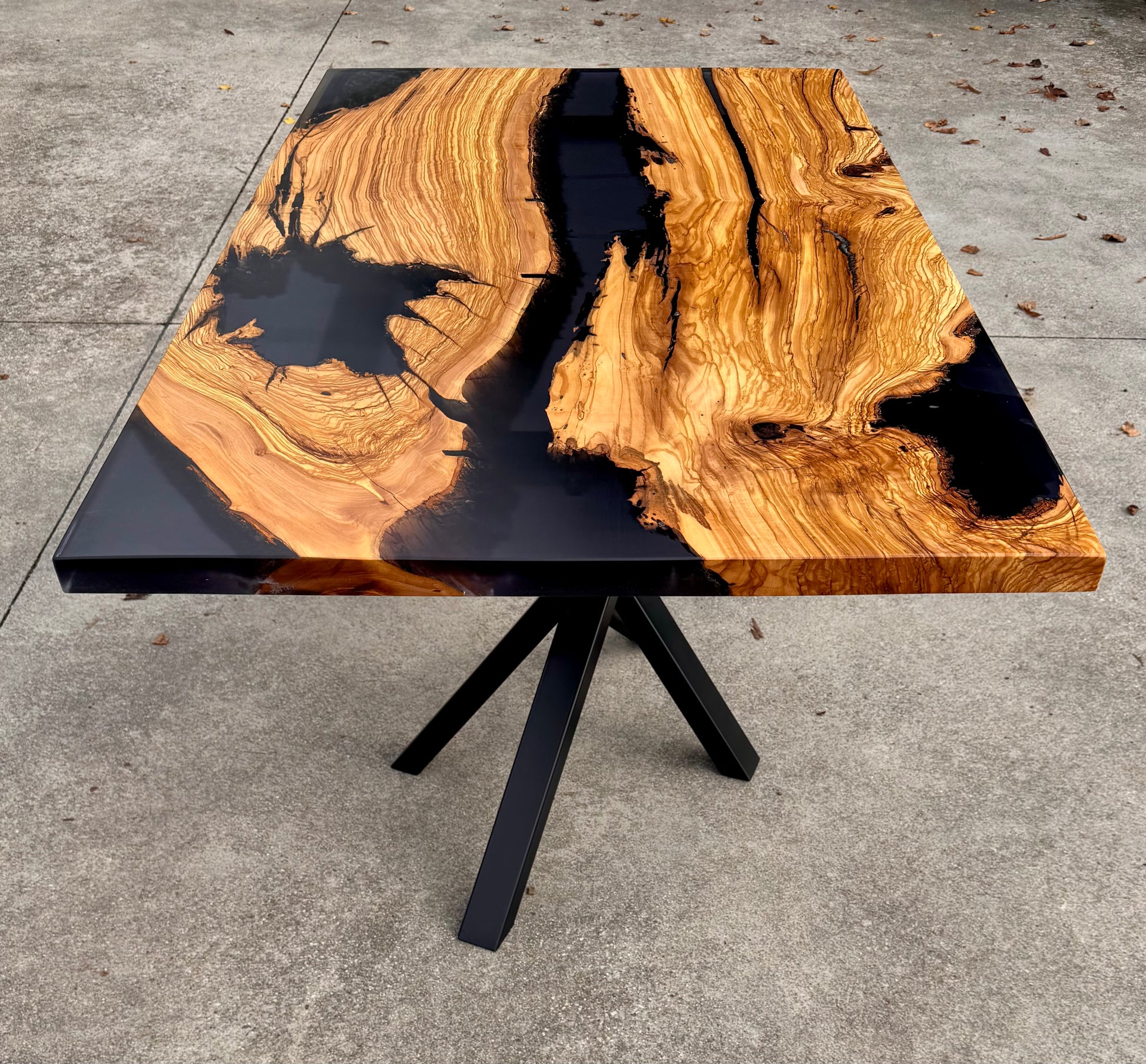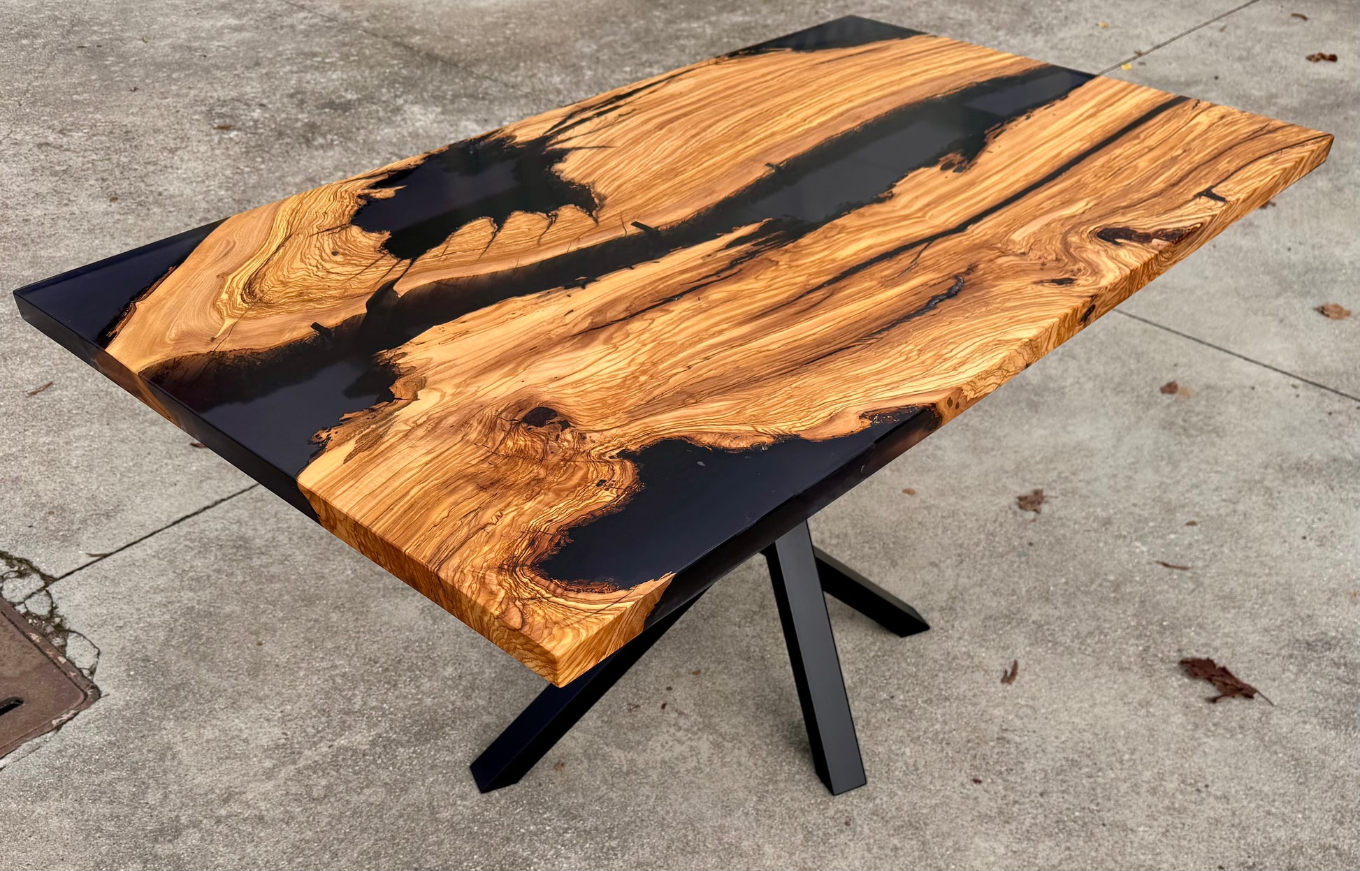 Bruno è un tavolo da pranzo realizzato in legno di ulivo e resina epossidica.