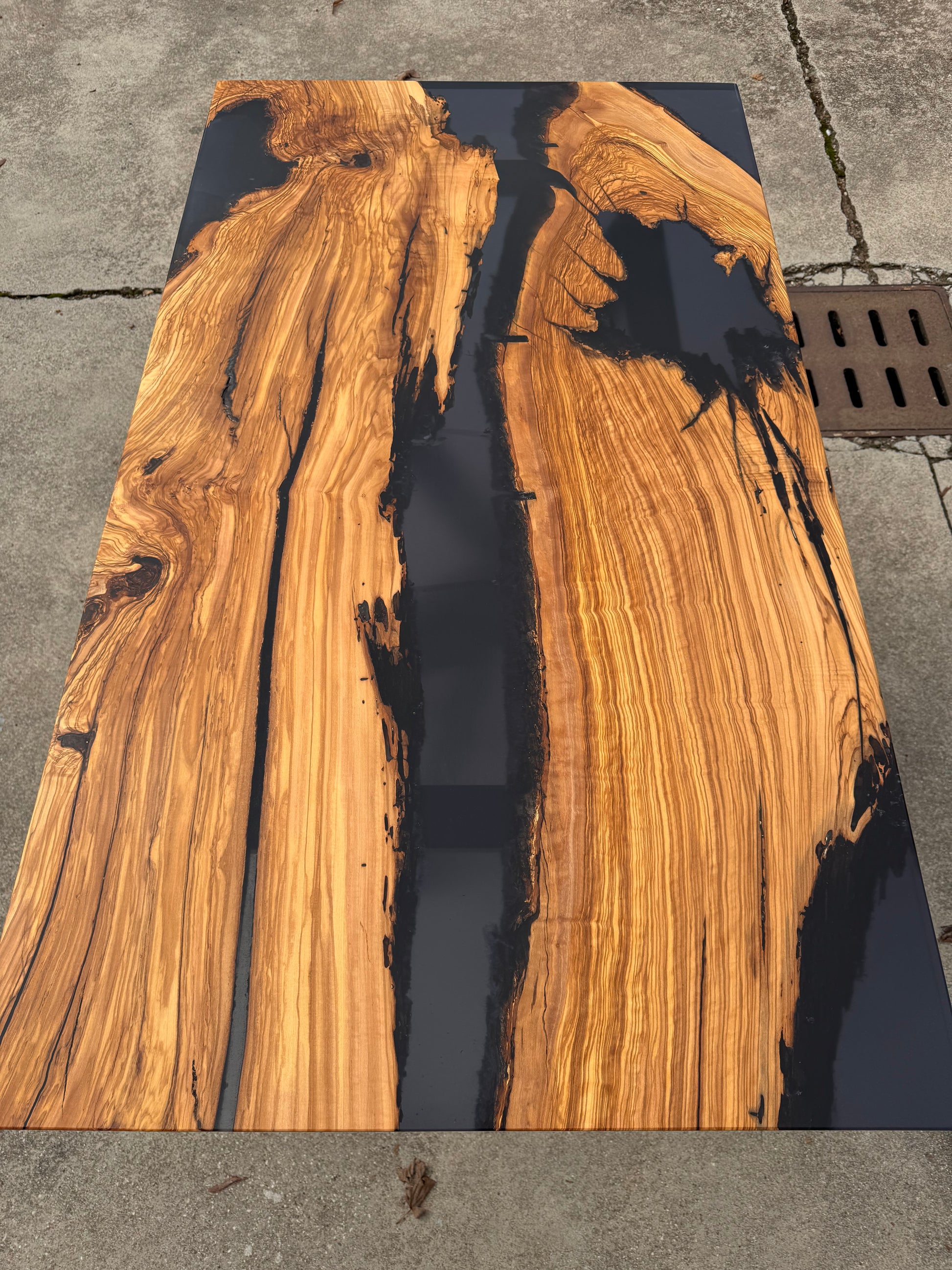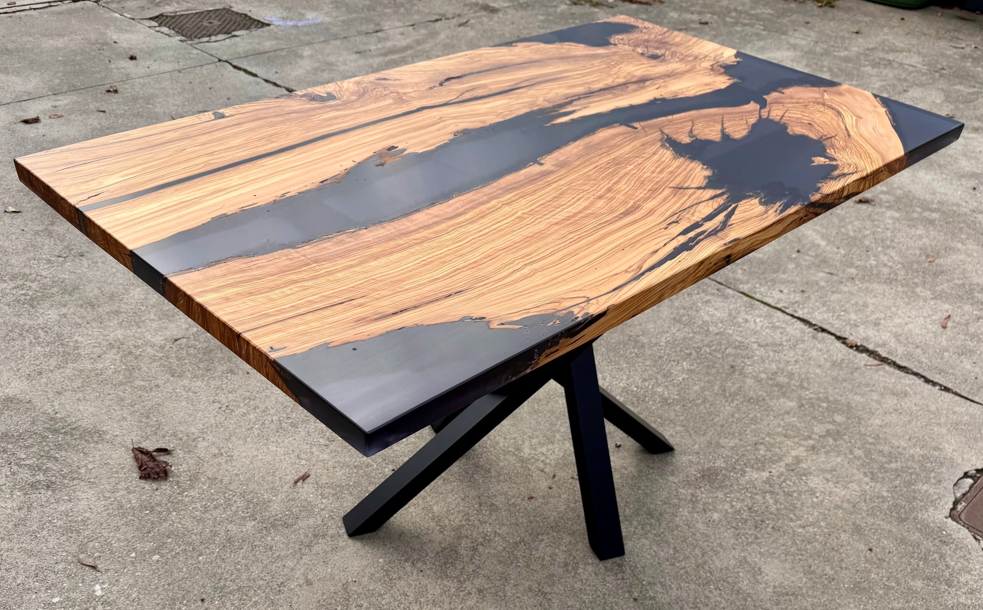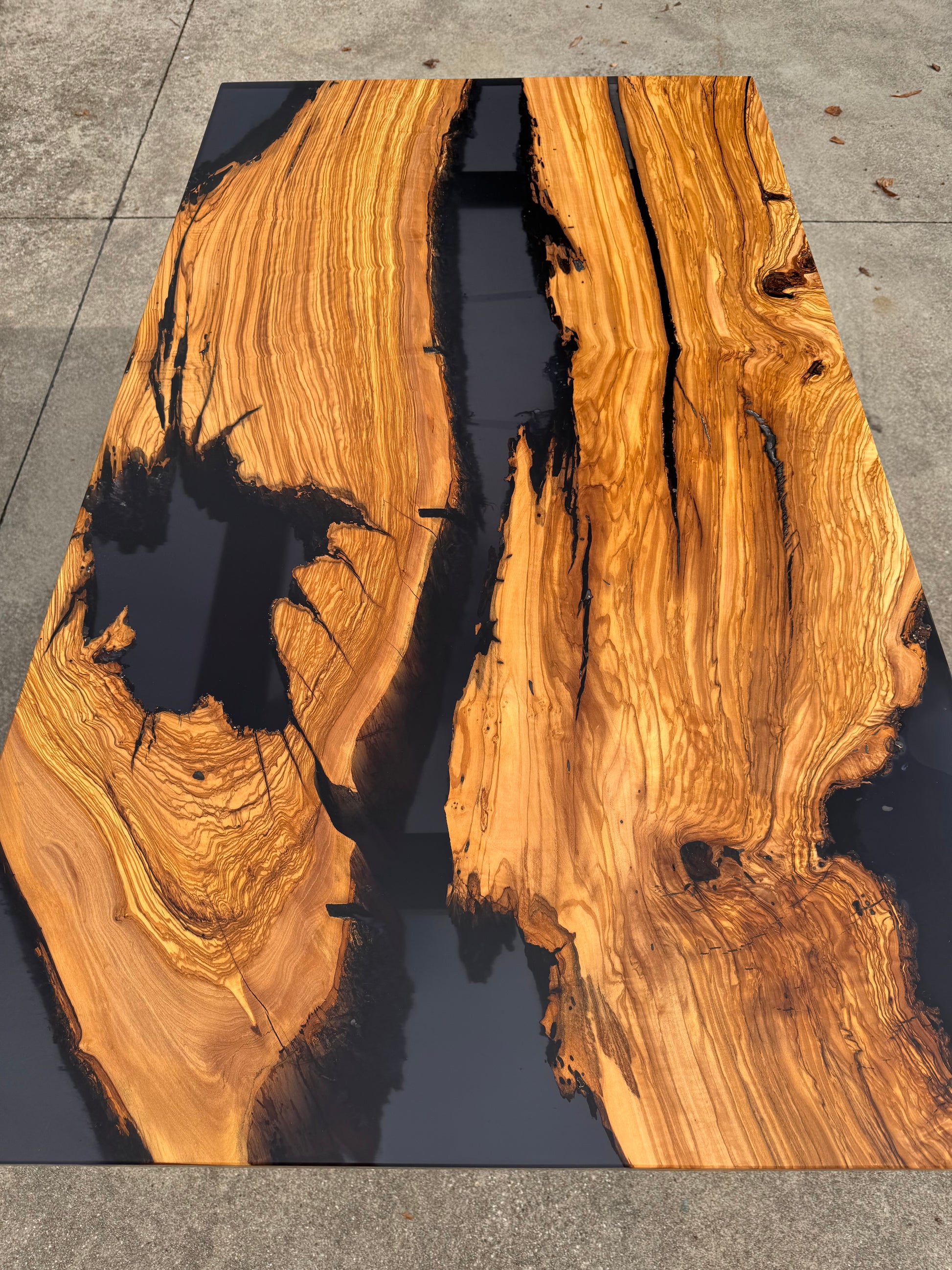 Bruno è un tavolo da pranzo realizzato in legno di ulivo e resina epossidica.