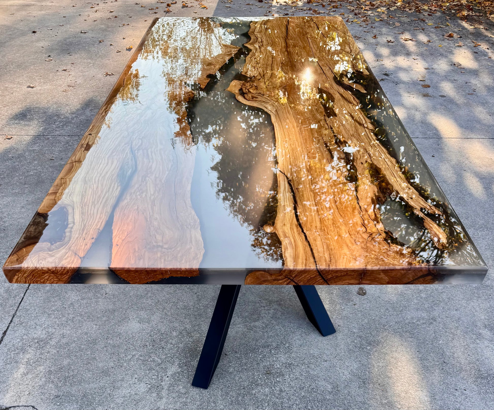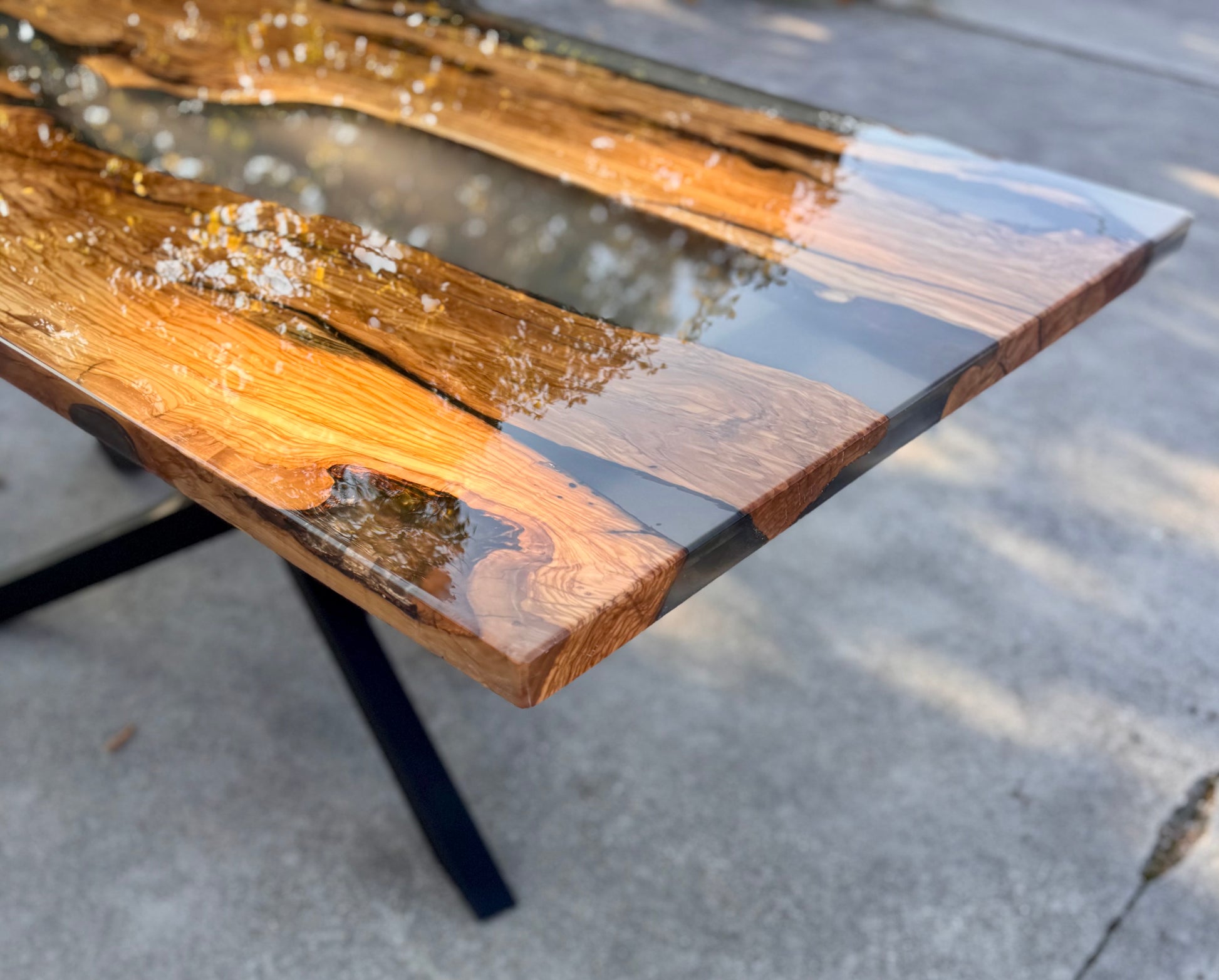 Prisma è un River Table composto da legno di ulivo e resina epossidica trasparente.