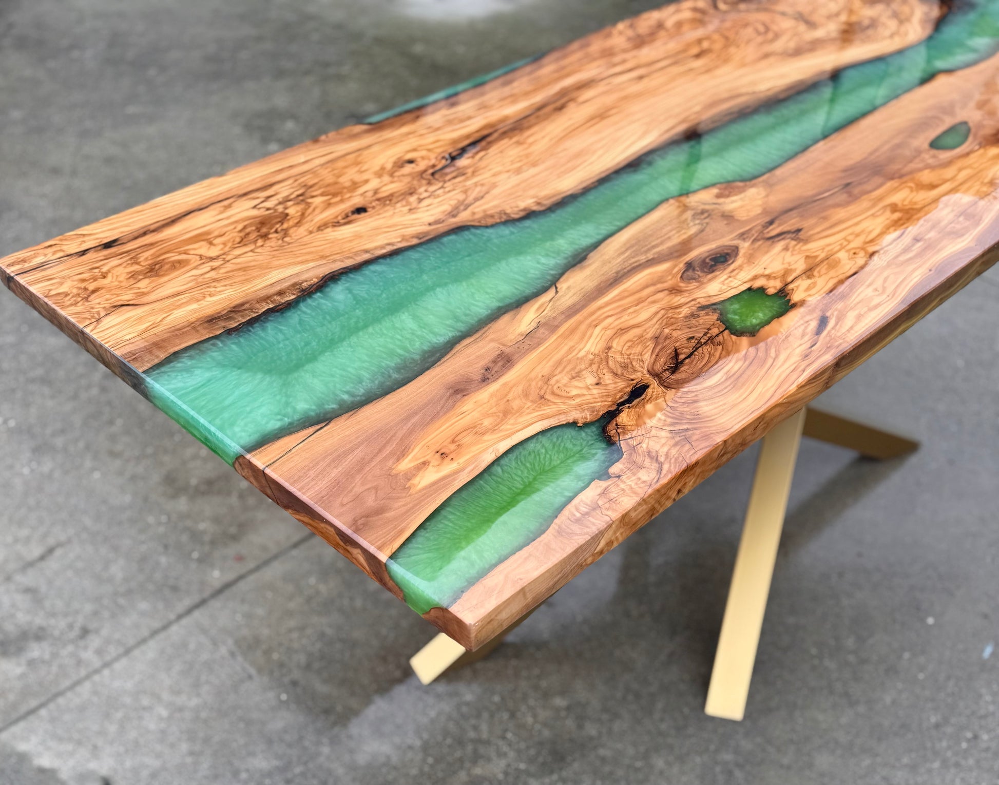 Il disegno prevede due assi di ulivo con fiume di resina centrale e a riempimento di fori e crepe. La colata di resina è composta da diverse pigmentazioni di verde tendenti allo smeraldo.