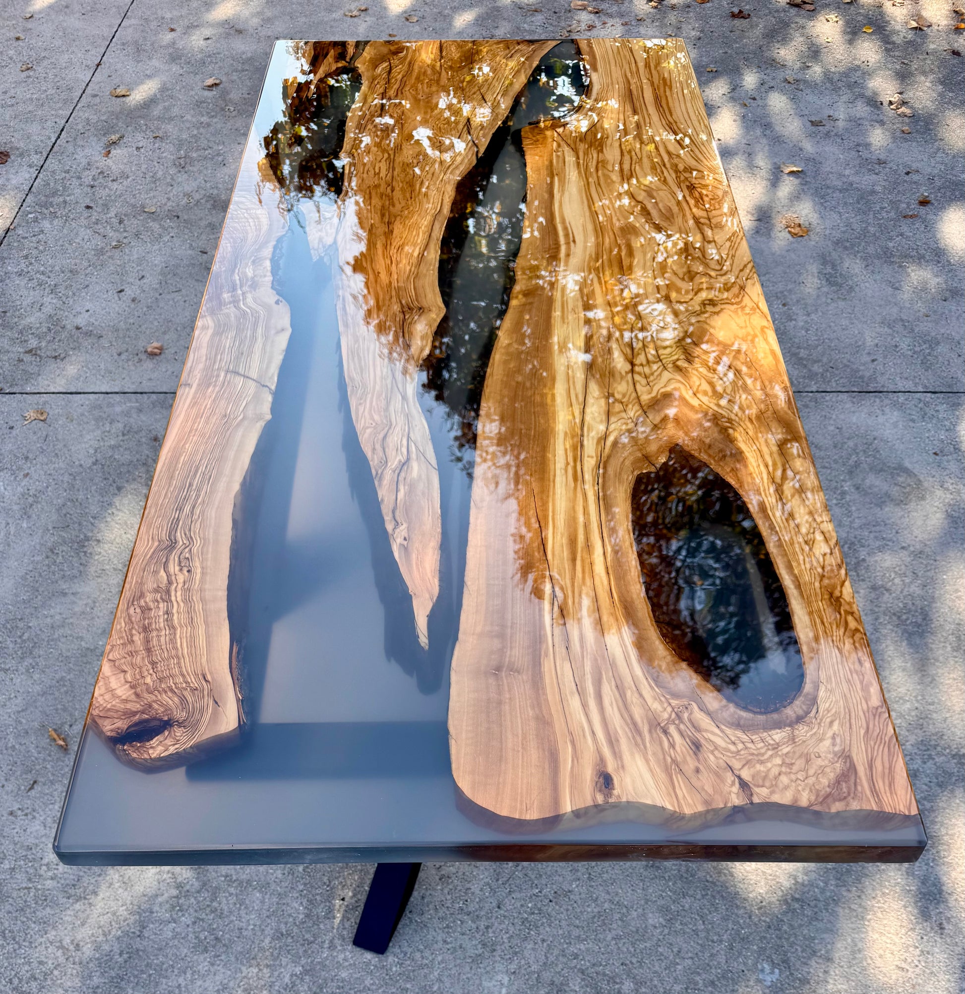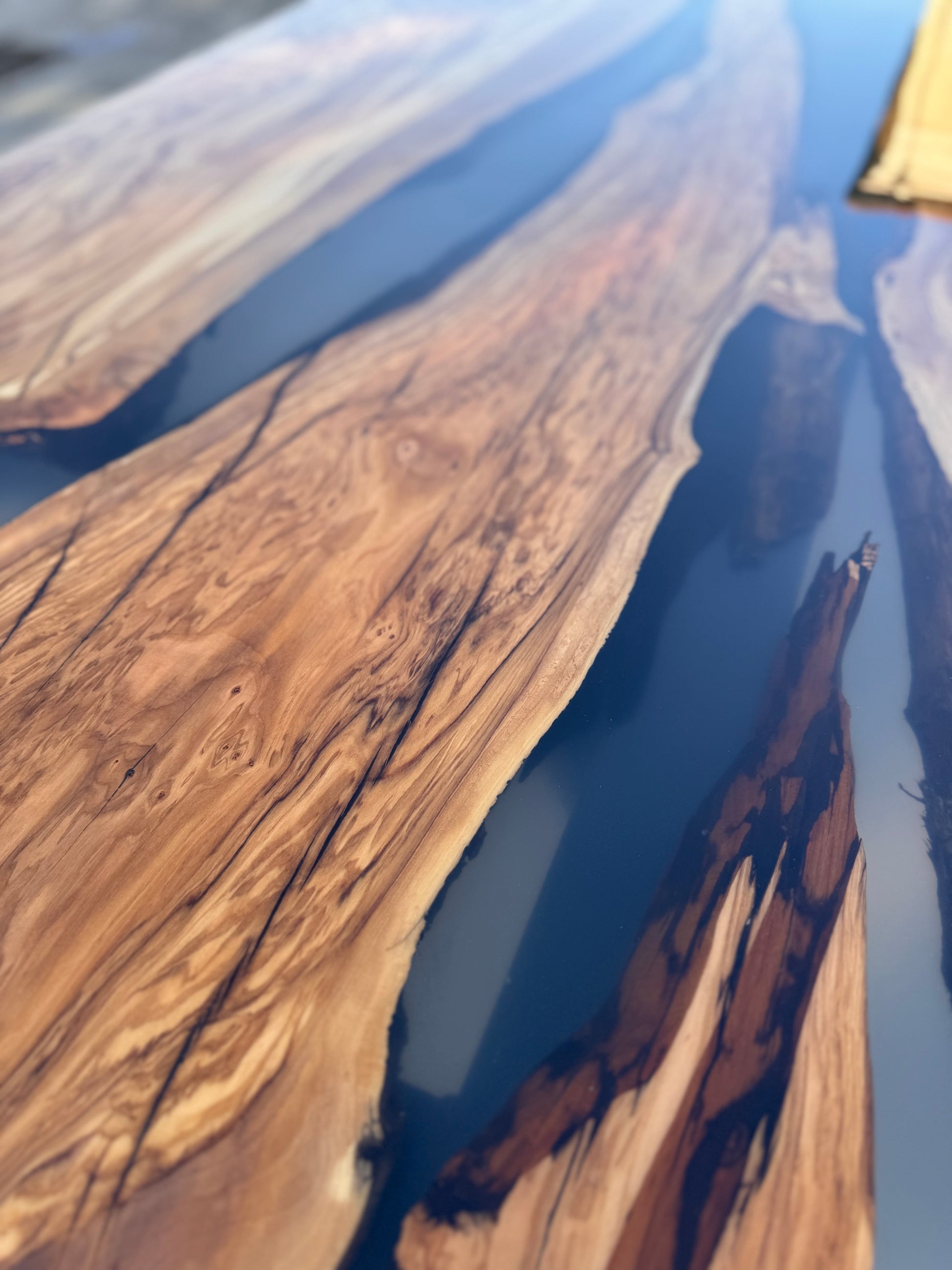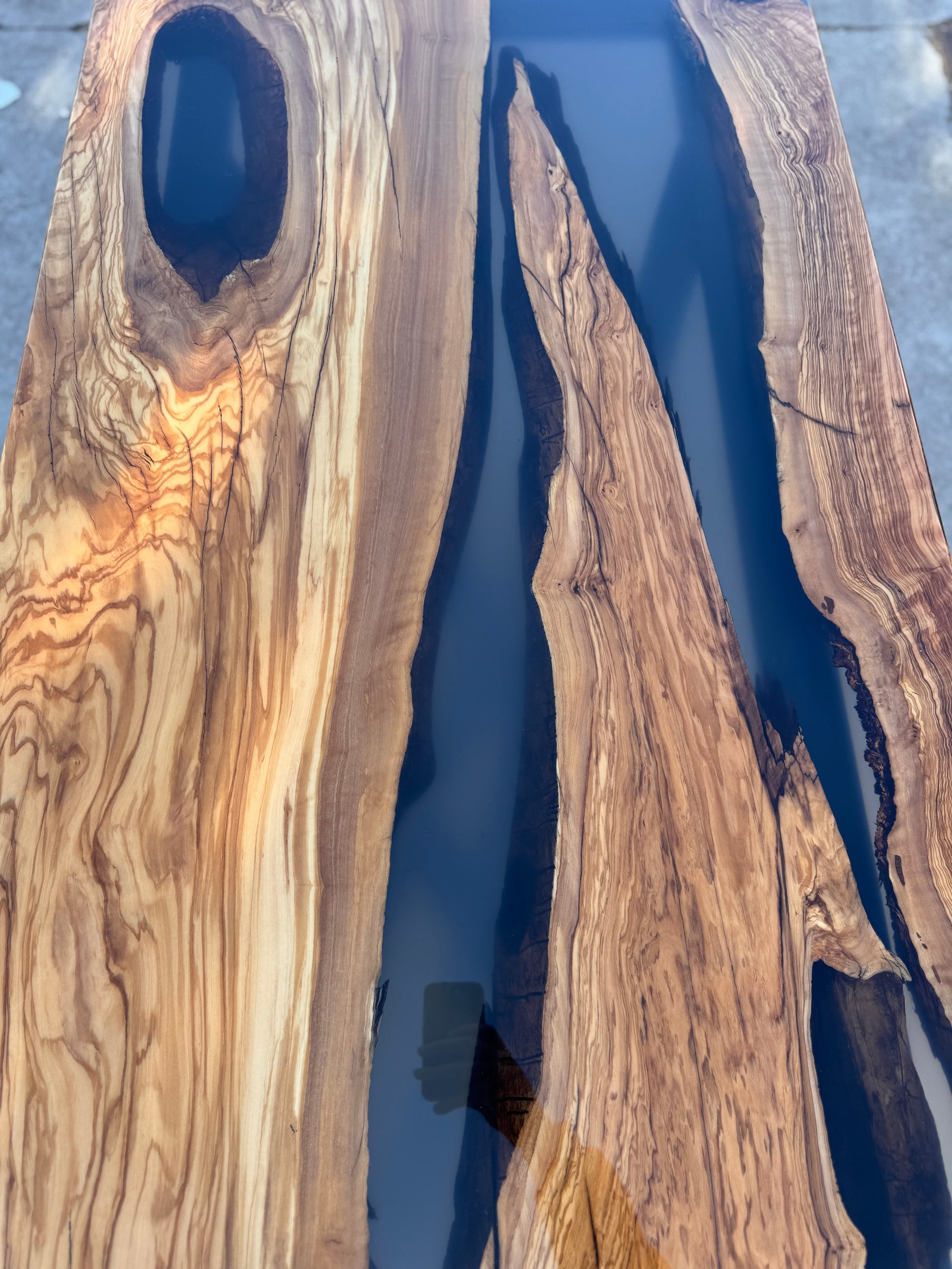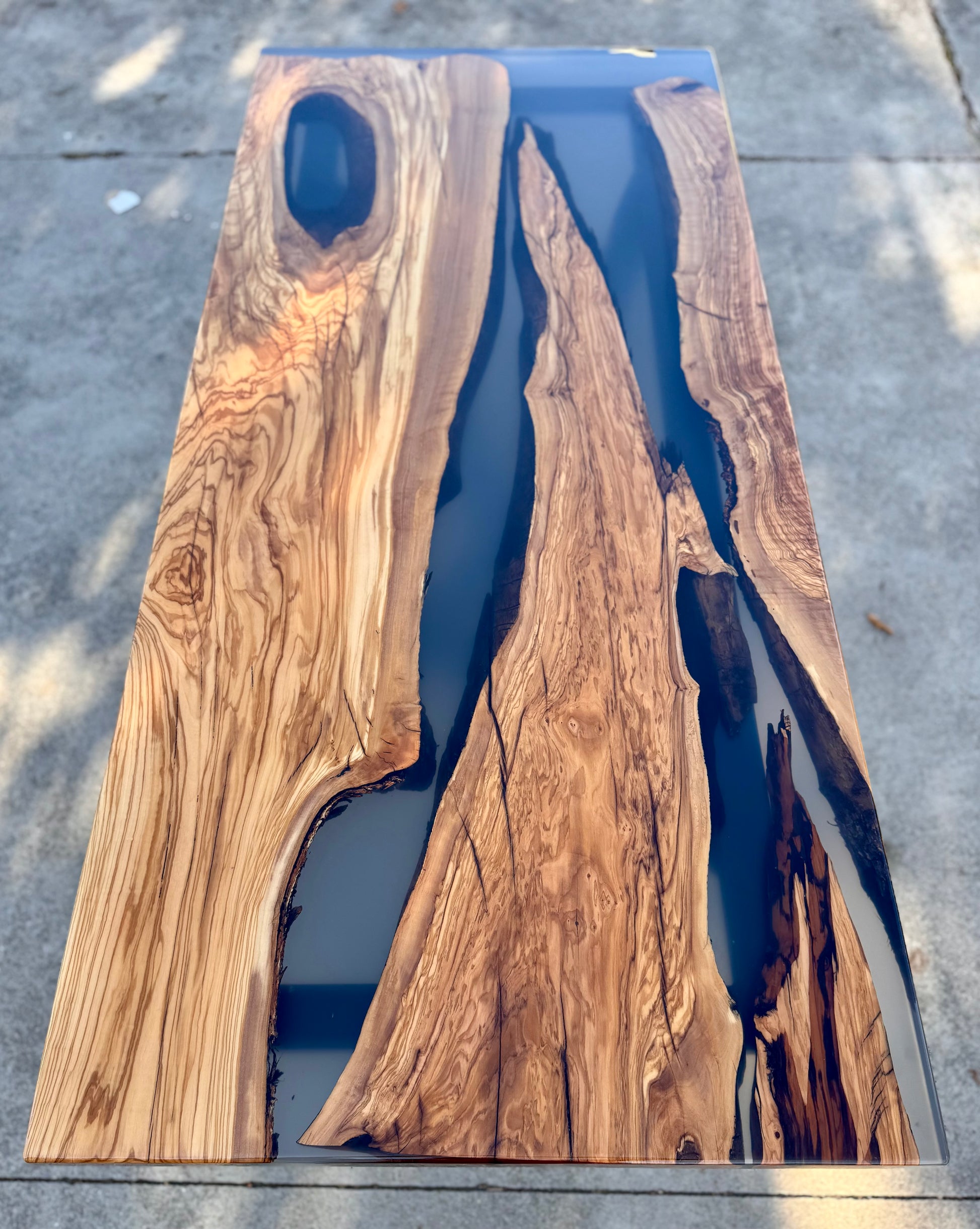 Per questo river table è stato utilizzato del legno di ulivo e resina epossidica fumee trasparente.