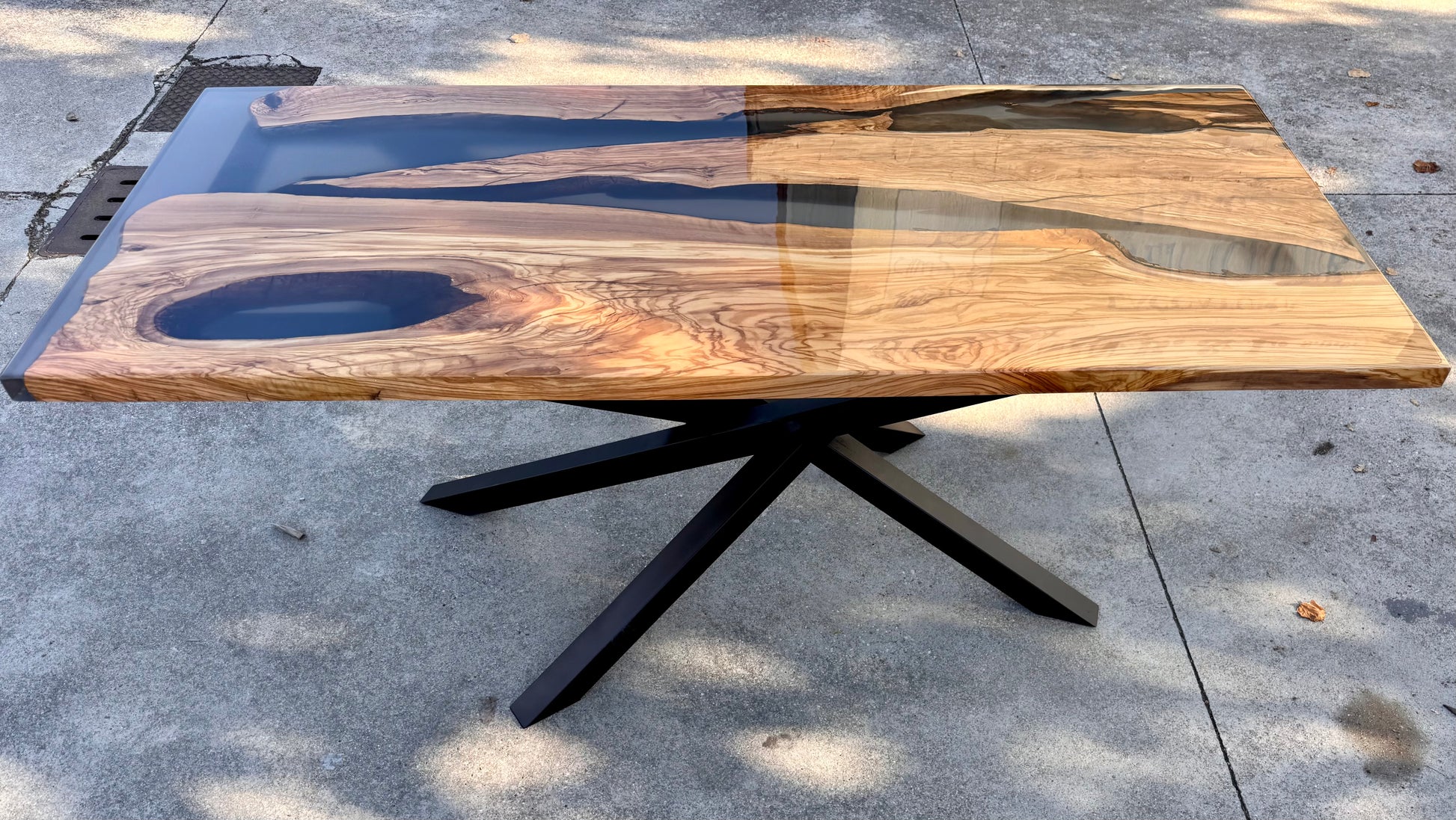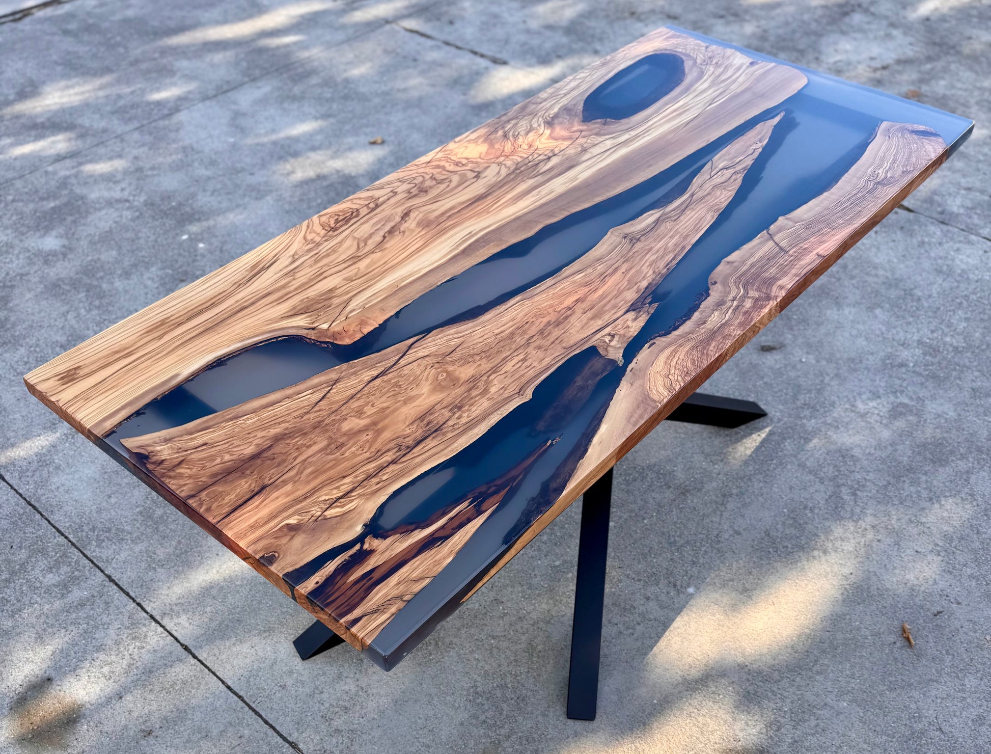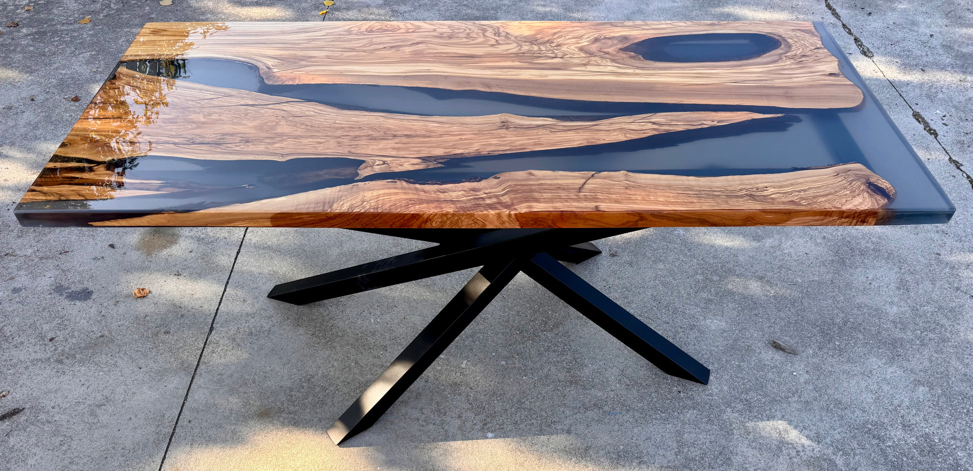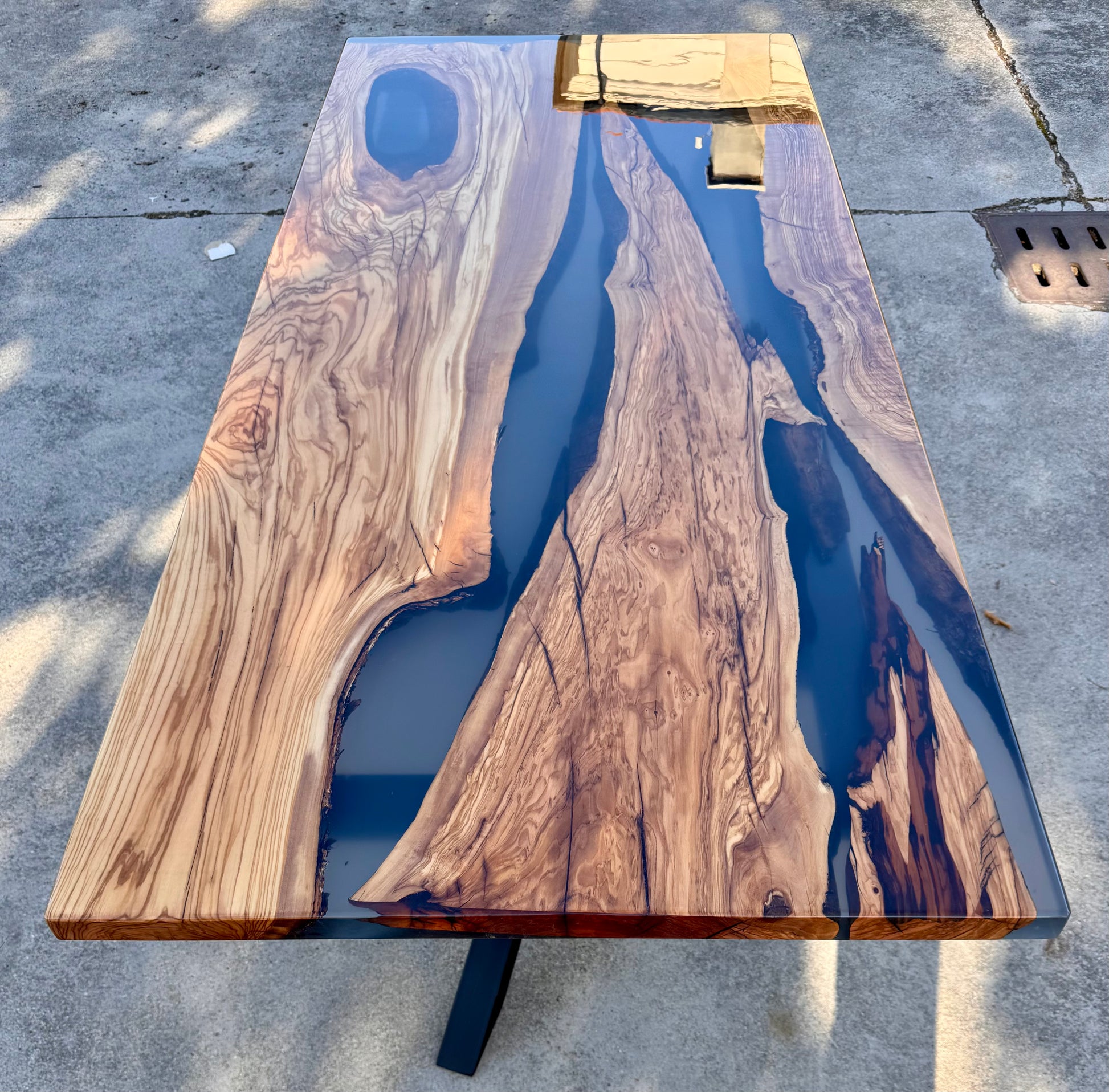 Per questo river table è stato utilizzato del legno di ulivo e resina epossidica fumee trasparente.