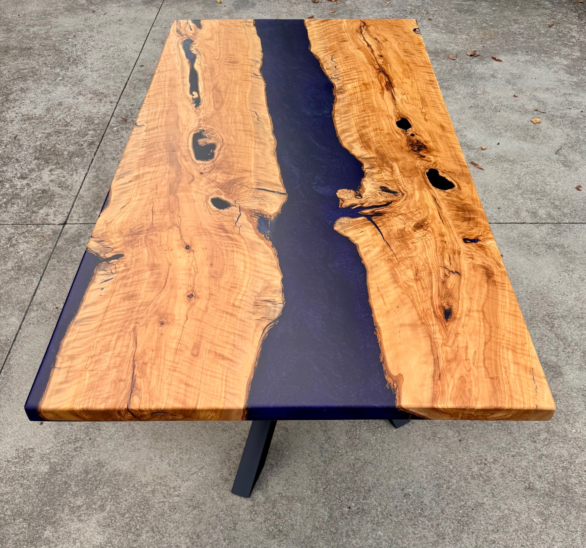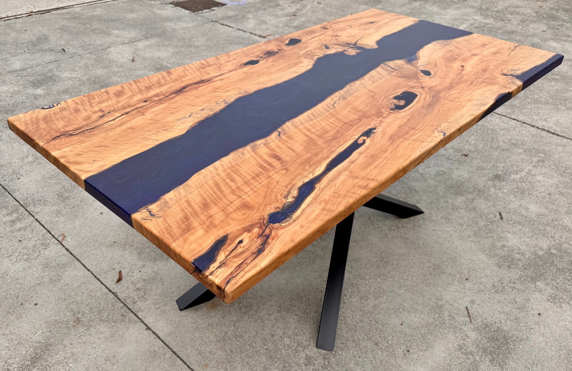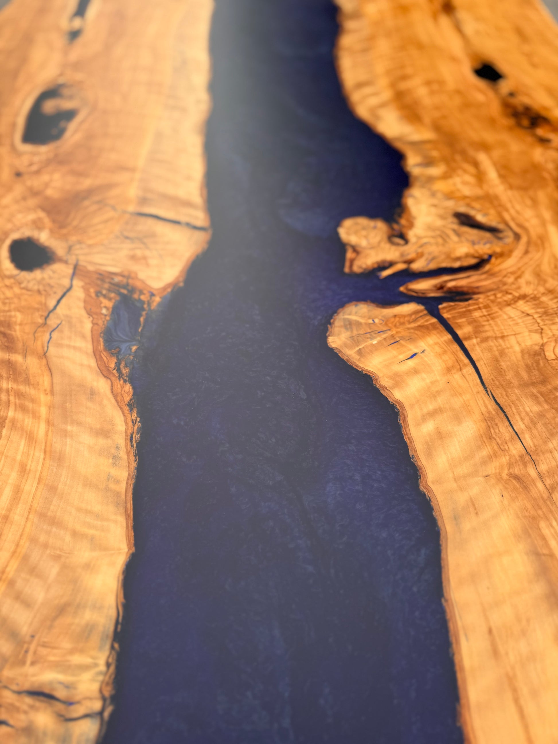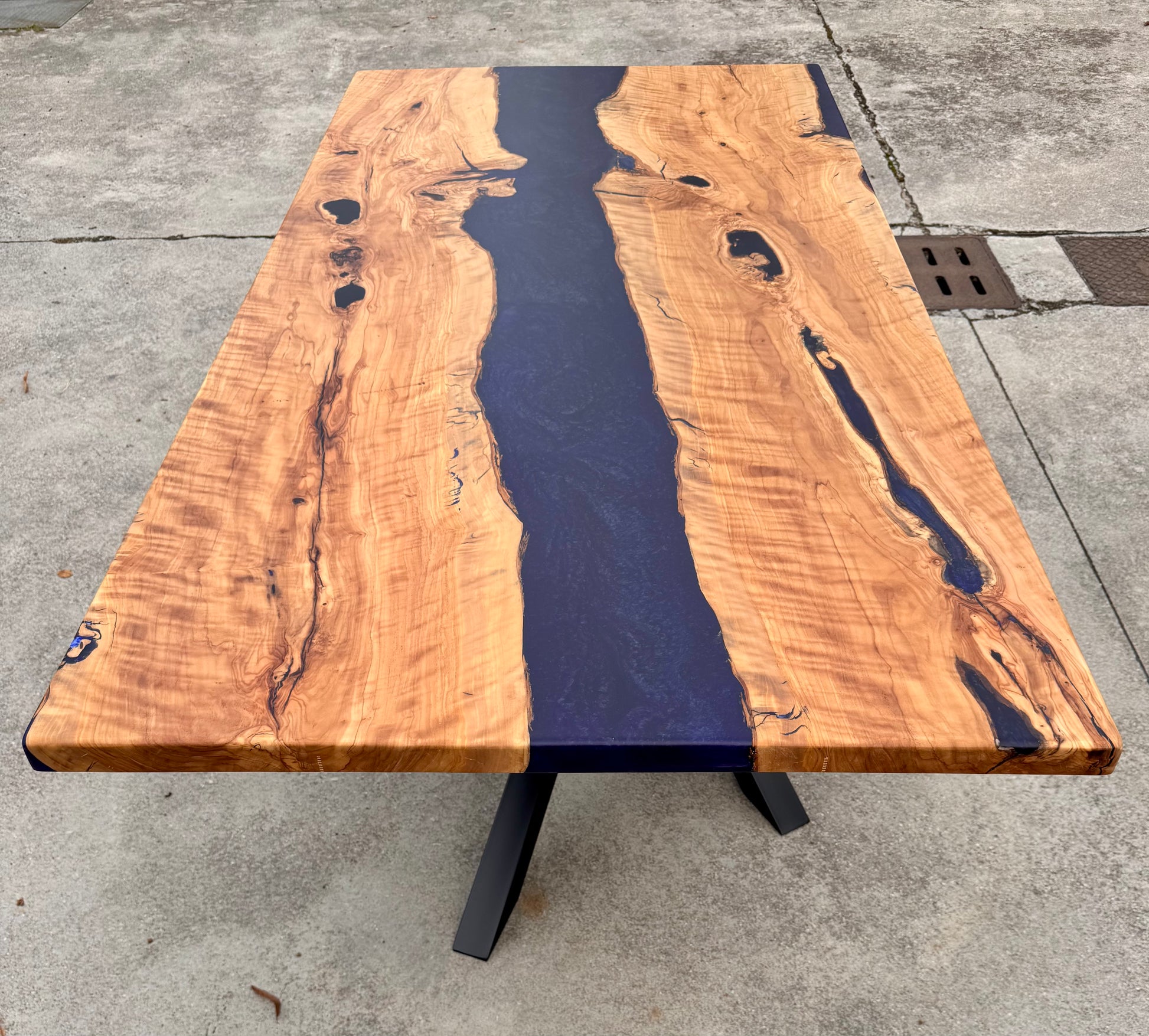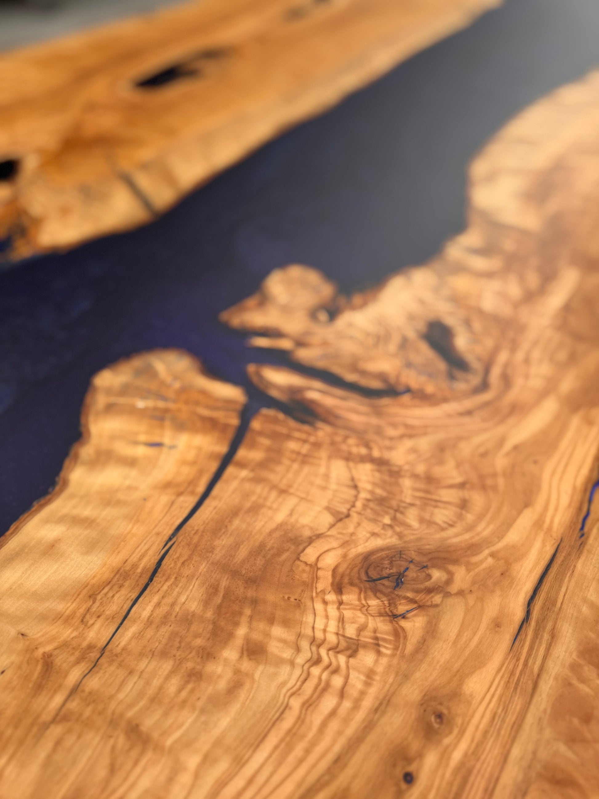 Notte è un tavolo da pranzo realizzato in legno di ulivo e resina epossidica.