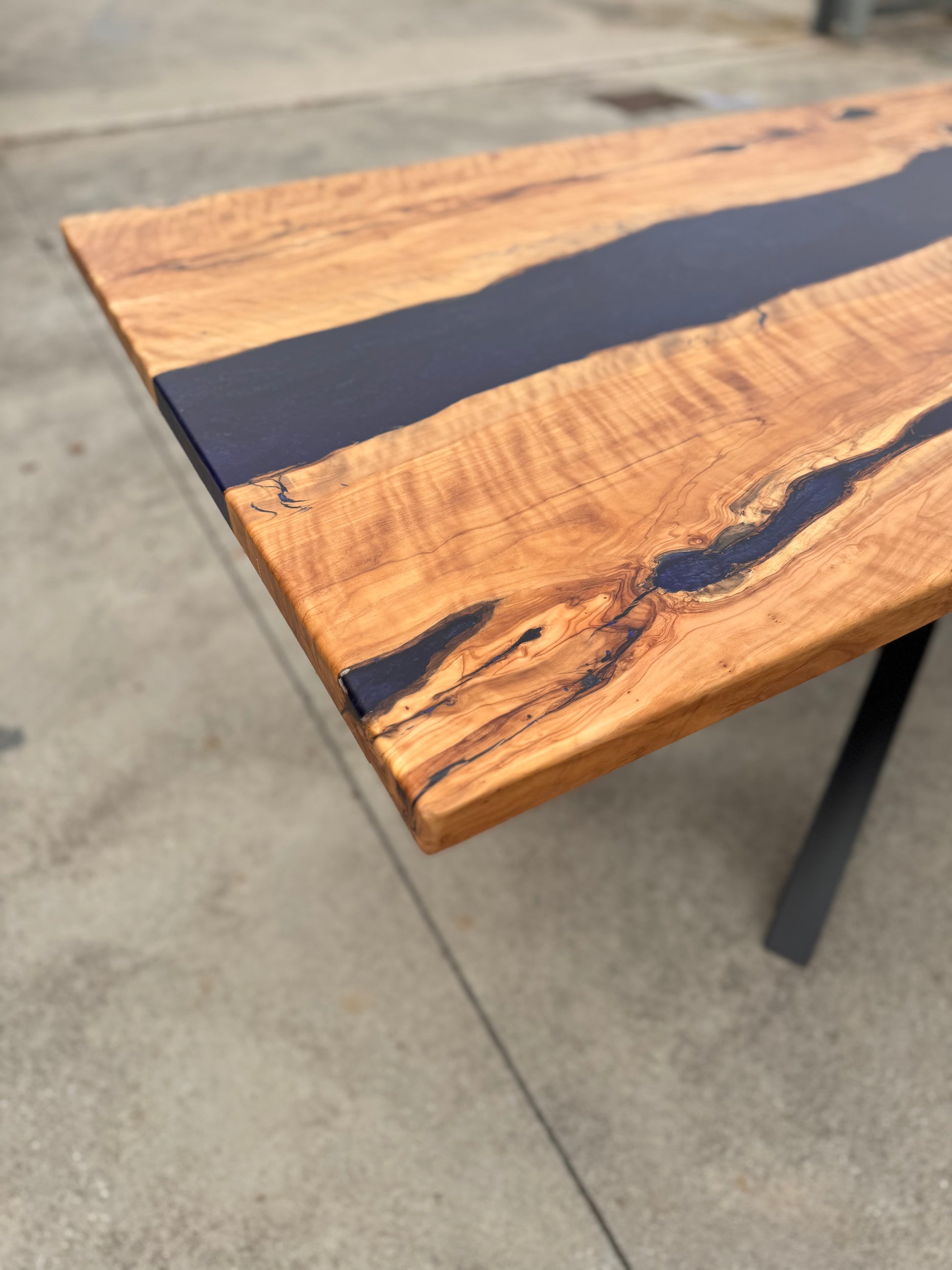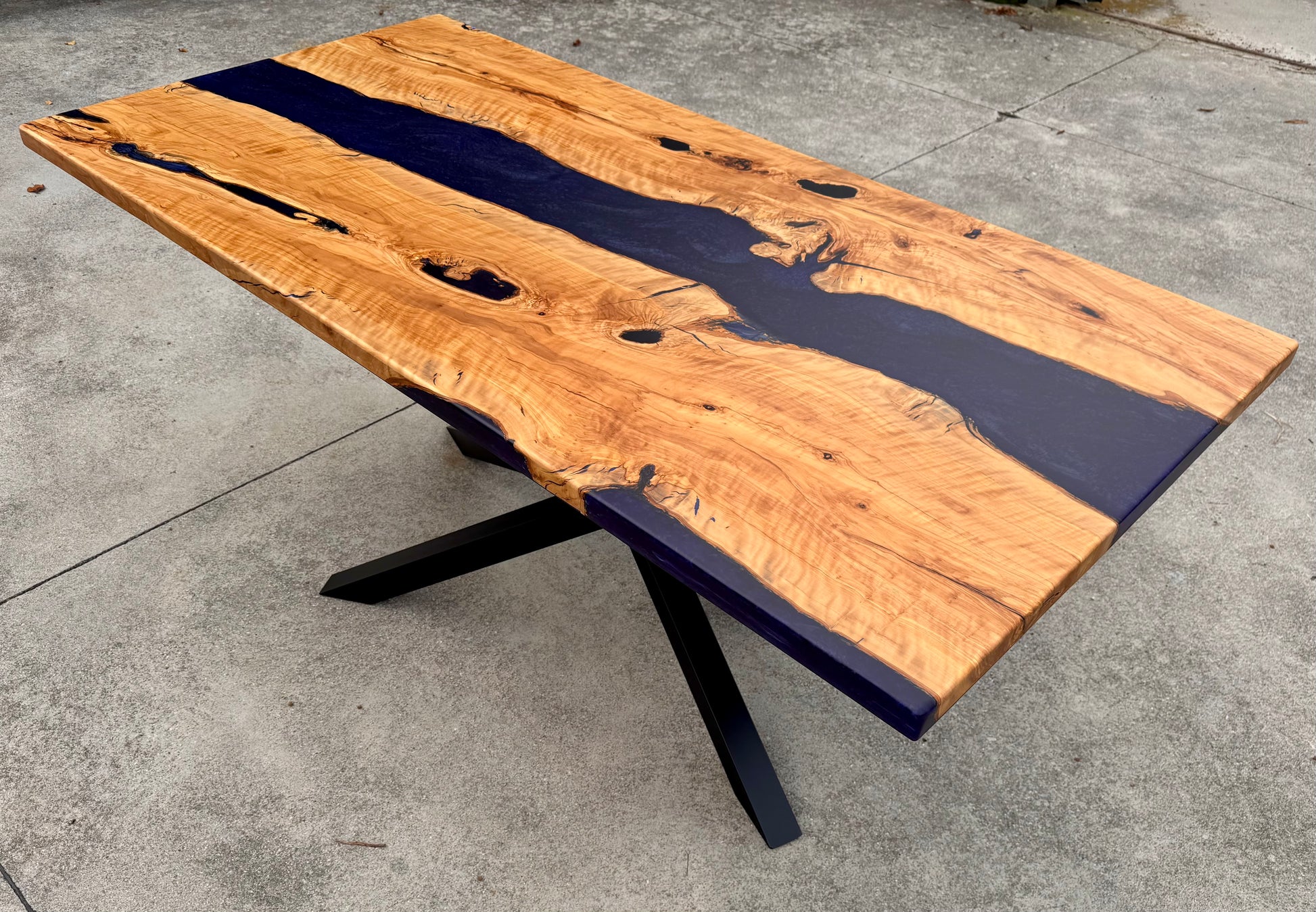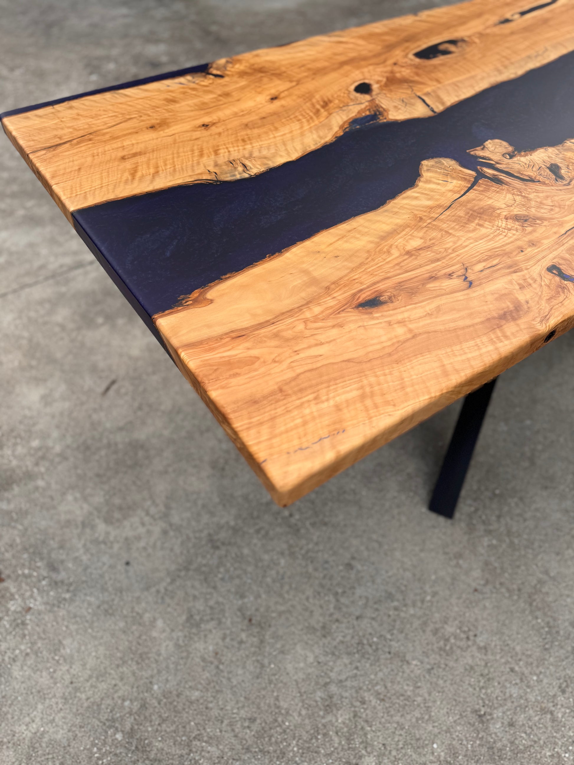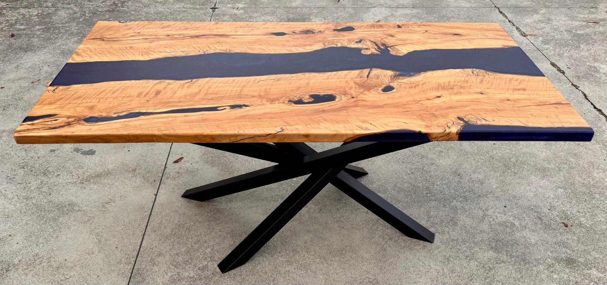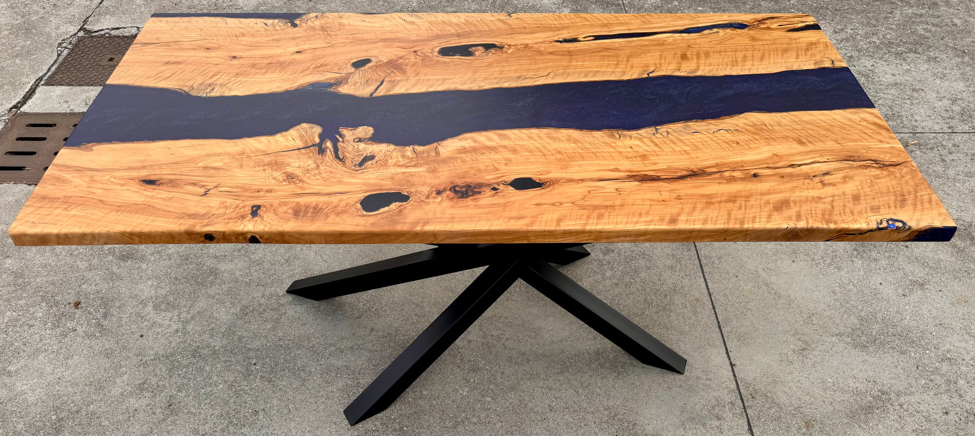 Notte è un tavolo da pranzo realizzato in legno di ulivo e resina epossidica.