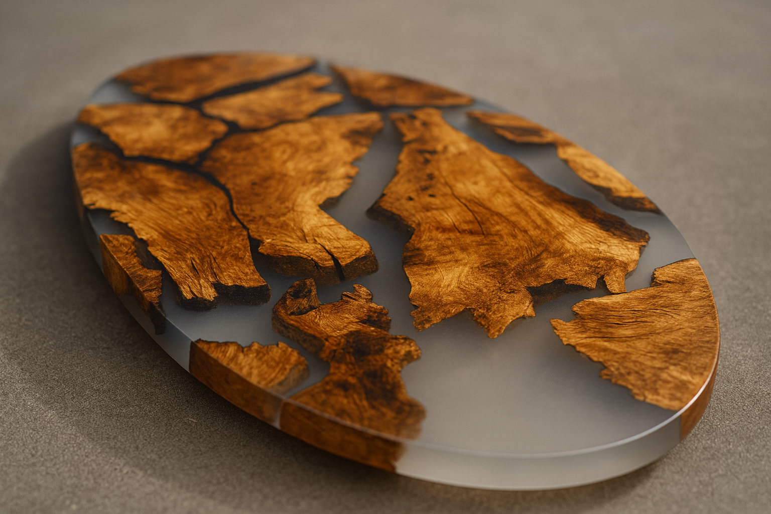 Legno naturale, resina epossidica, ferro saldato, finiture acriliche, poliesteri o ad olio.