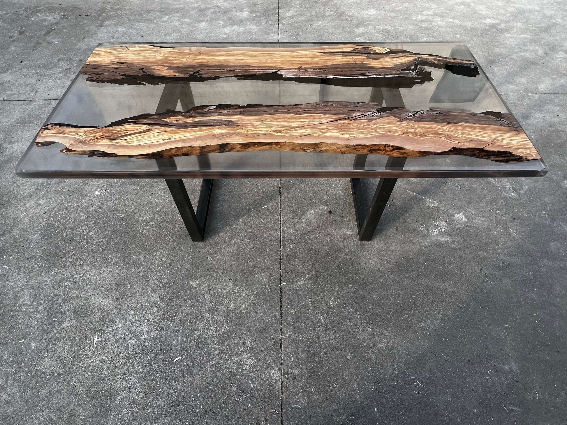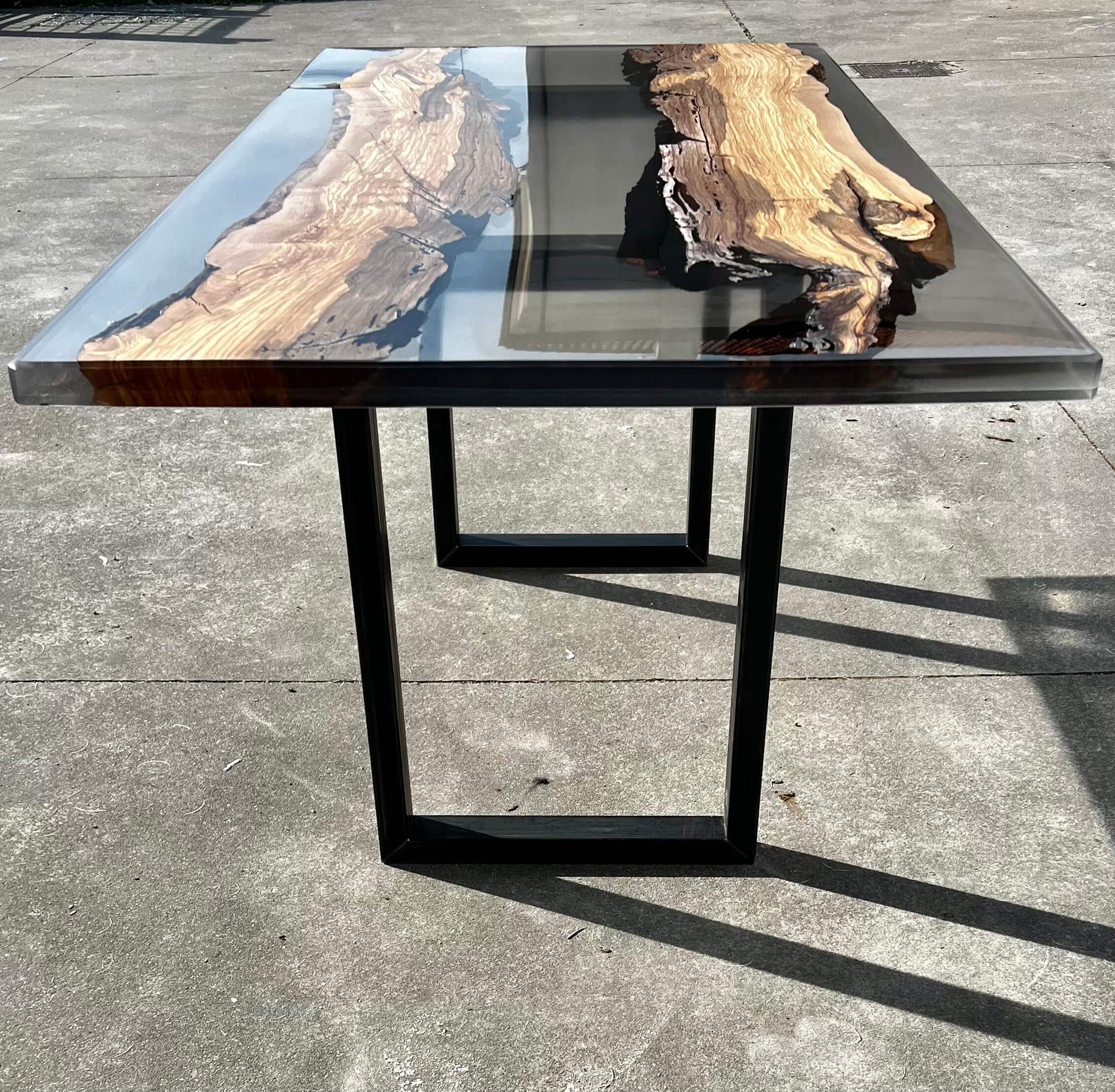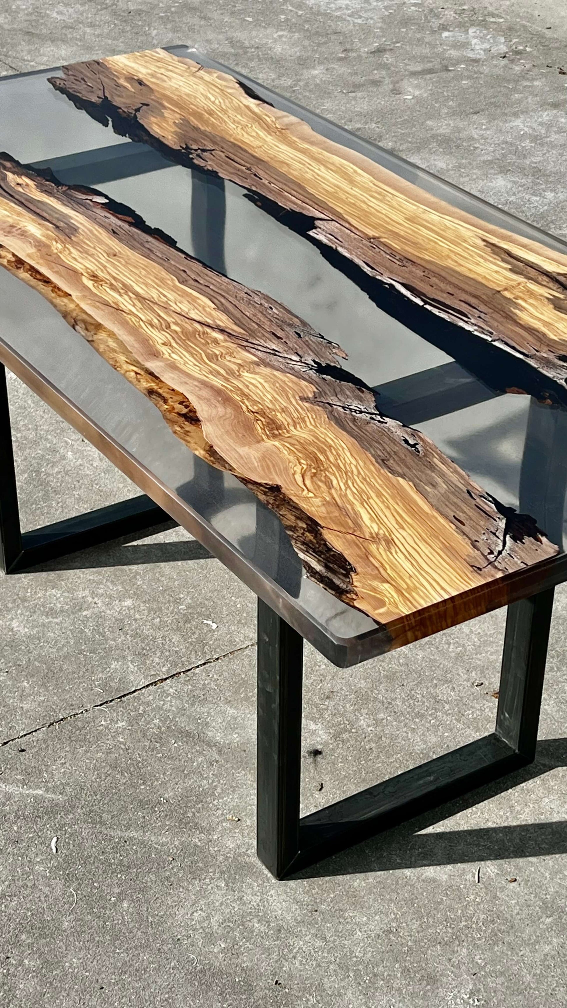 Questa tavolo è stato realizzato con due tranci di ulivo leccese e resina epossidica effetto fumee.