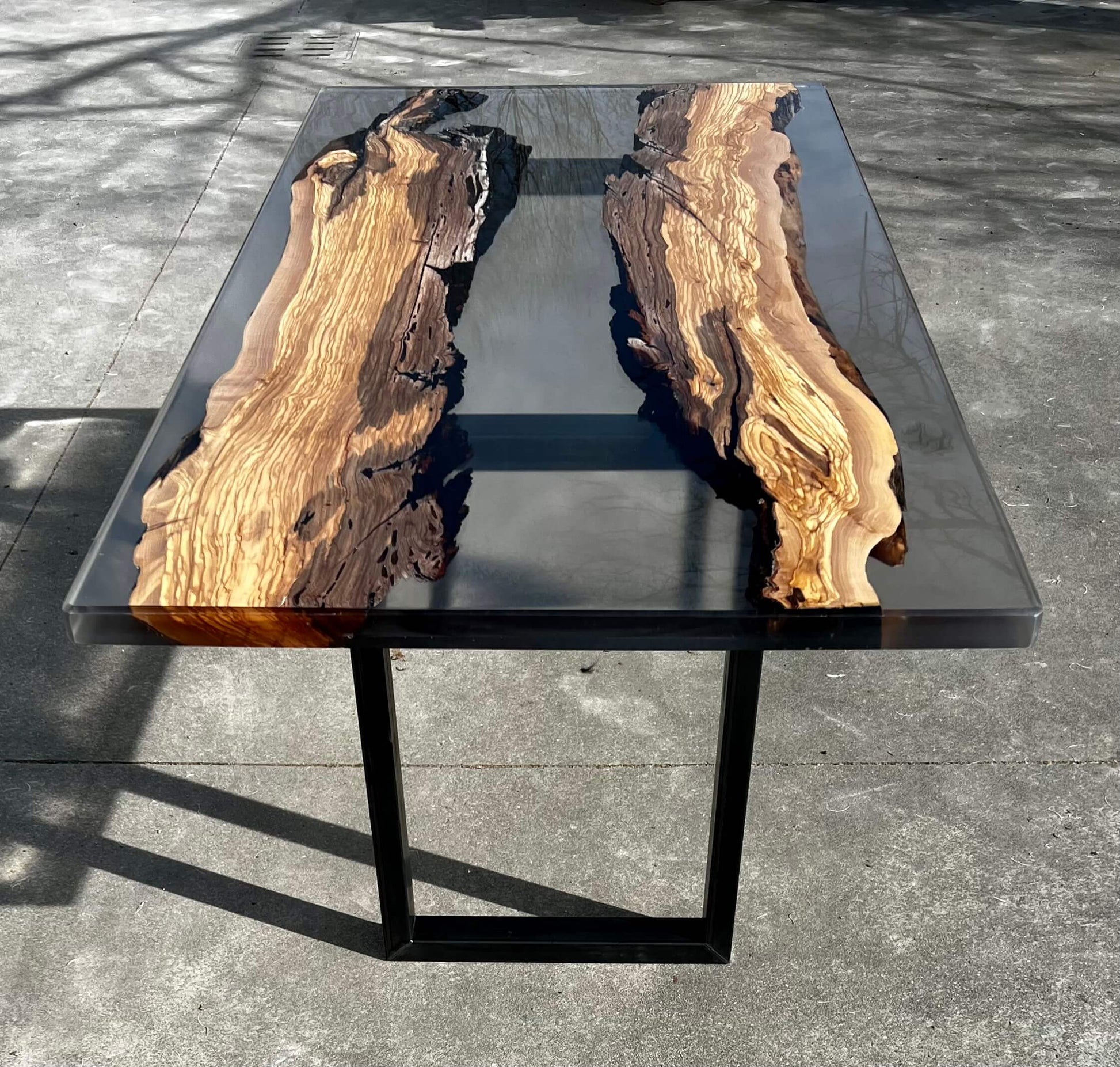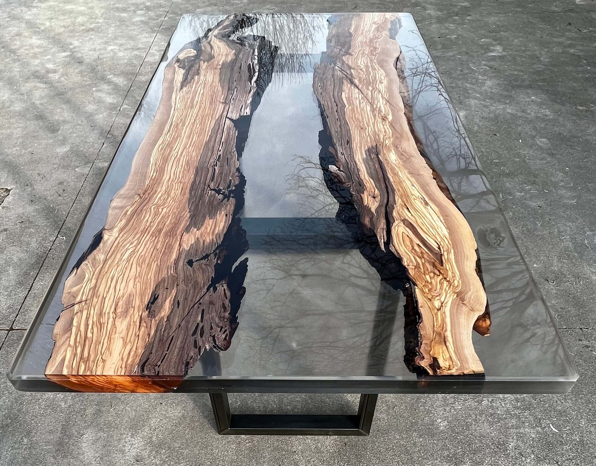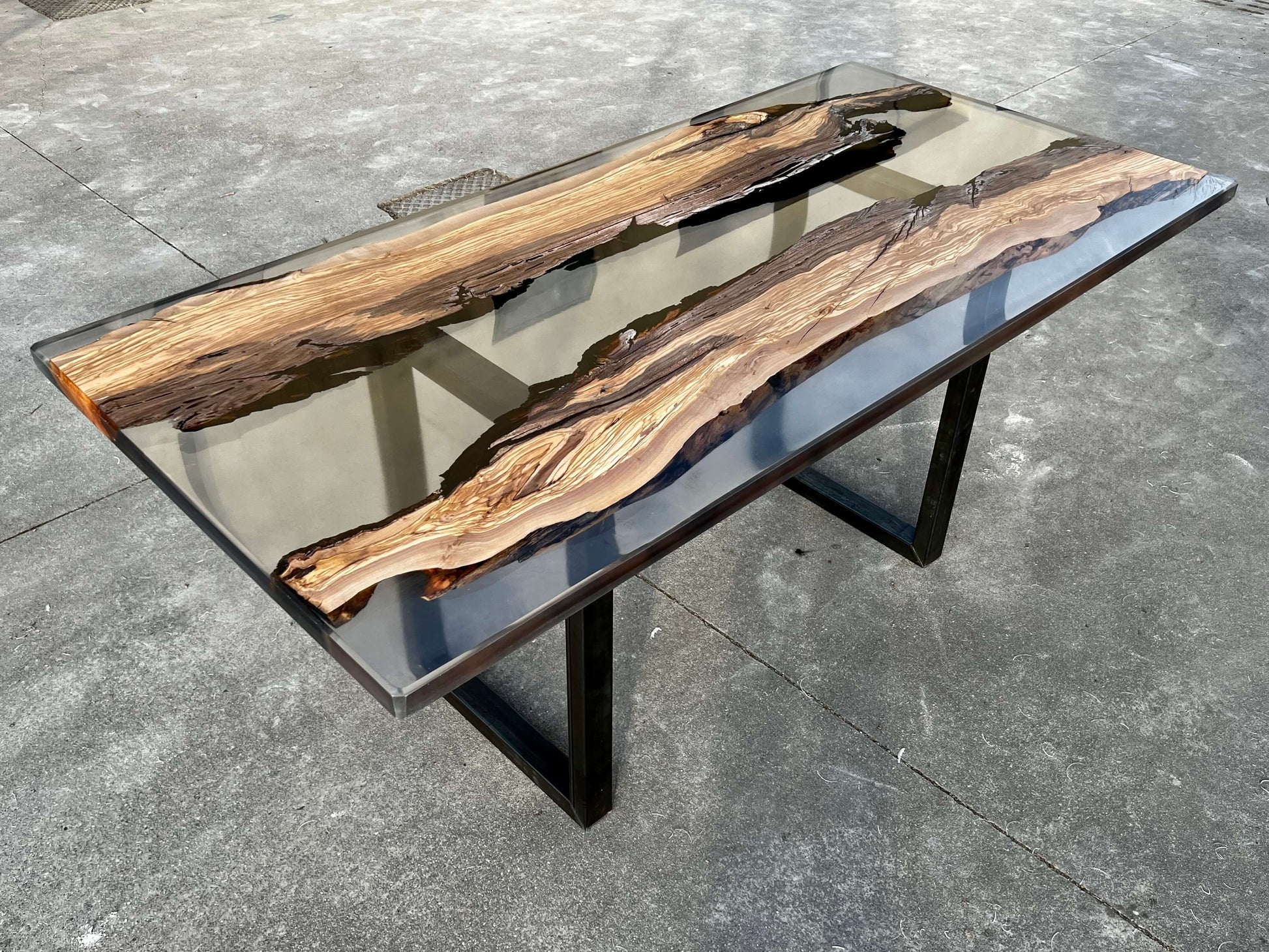 Questa tavolo è stato realizzato con due tranci di ulivo leccese e resina epossidica effetto fumee.